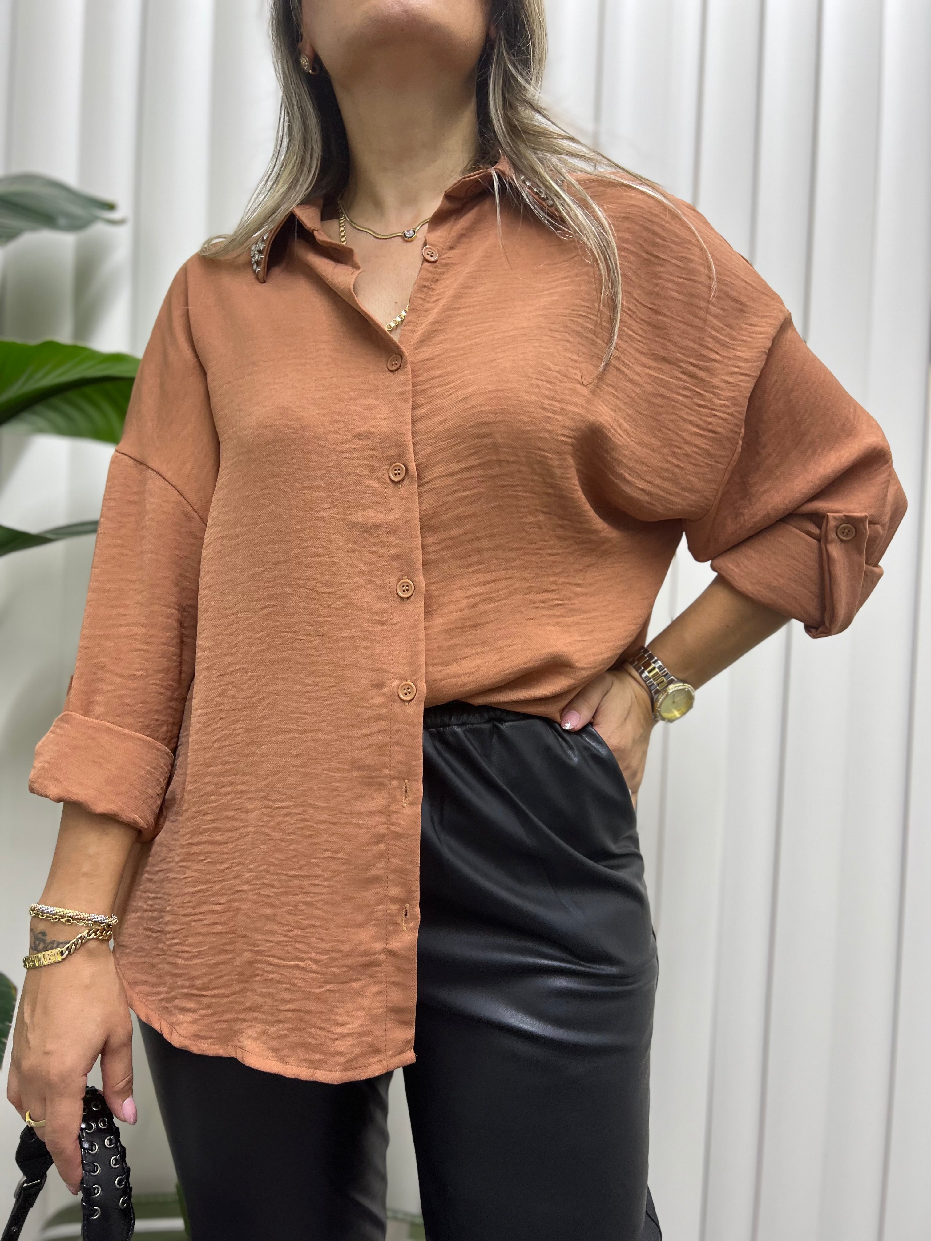 A01483 yaka taşlı kremit gömlek rahat kalıptır