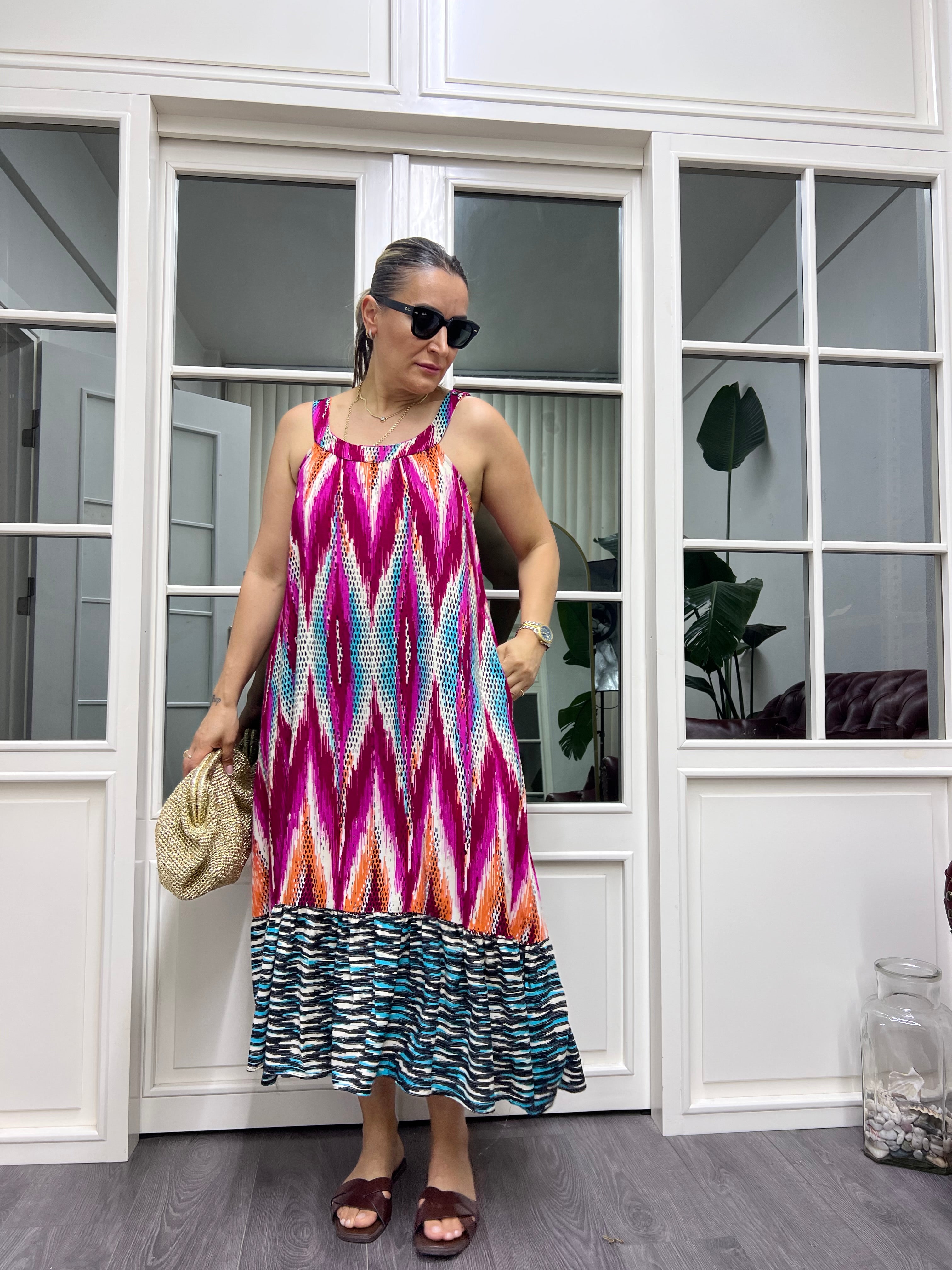 A01934 askılı etekleri fırfırlı viskon elbise