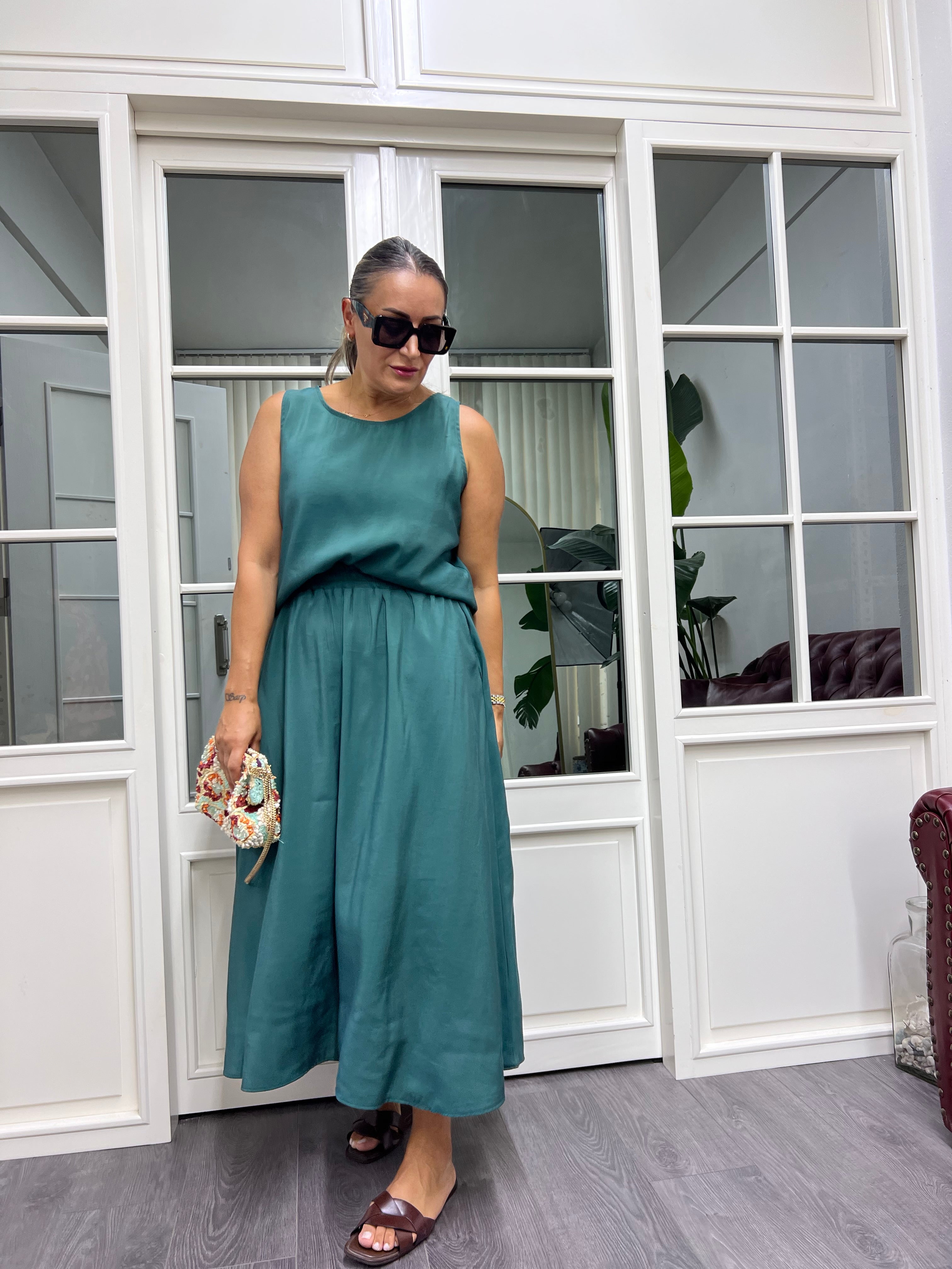 A02039 yeşil crep kumaş beli lastikli etek takım