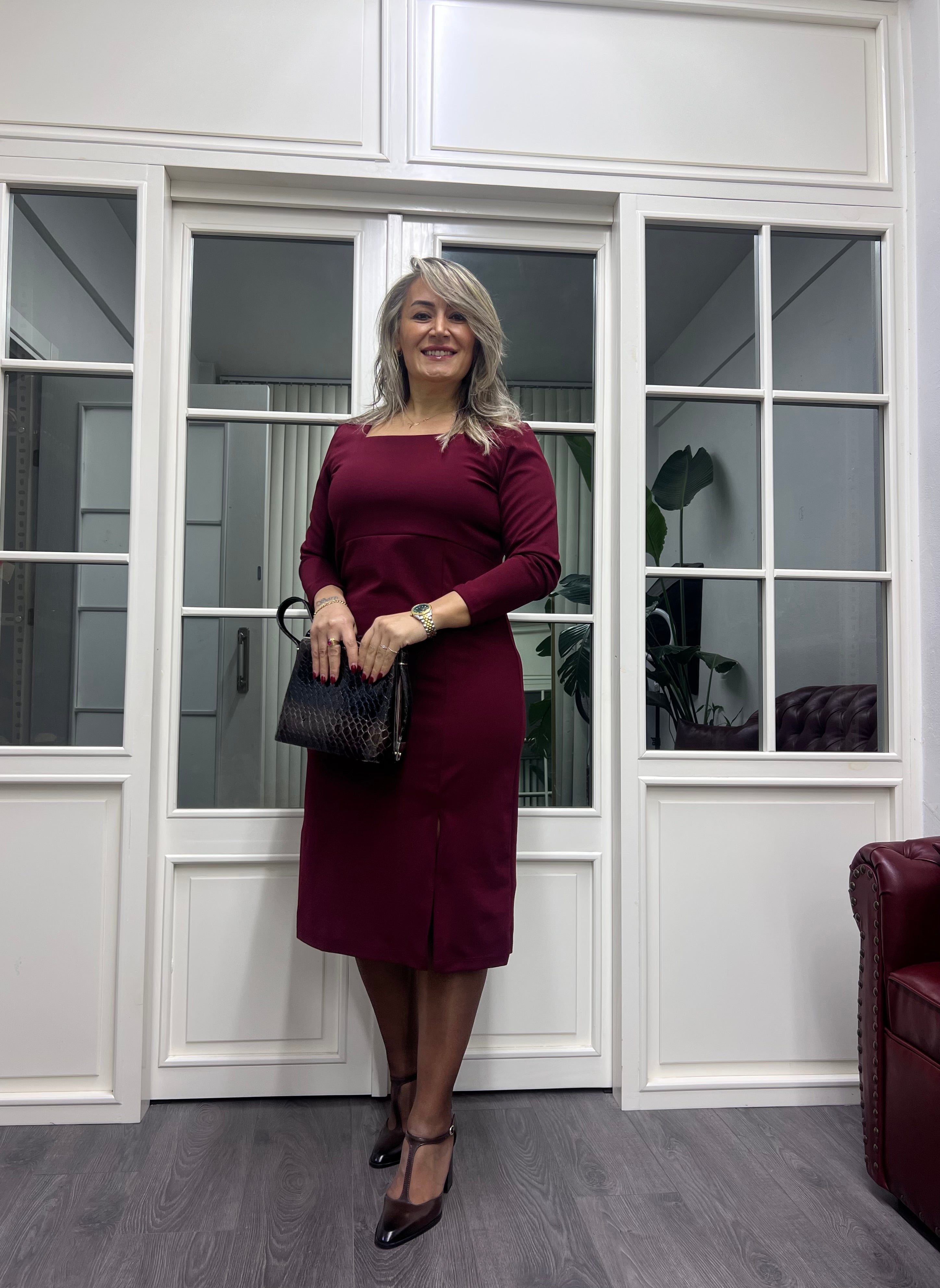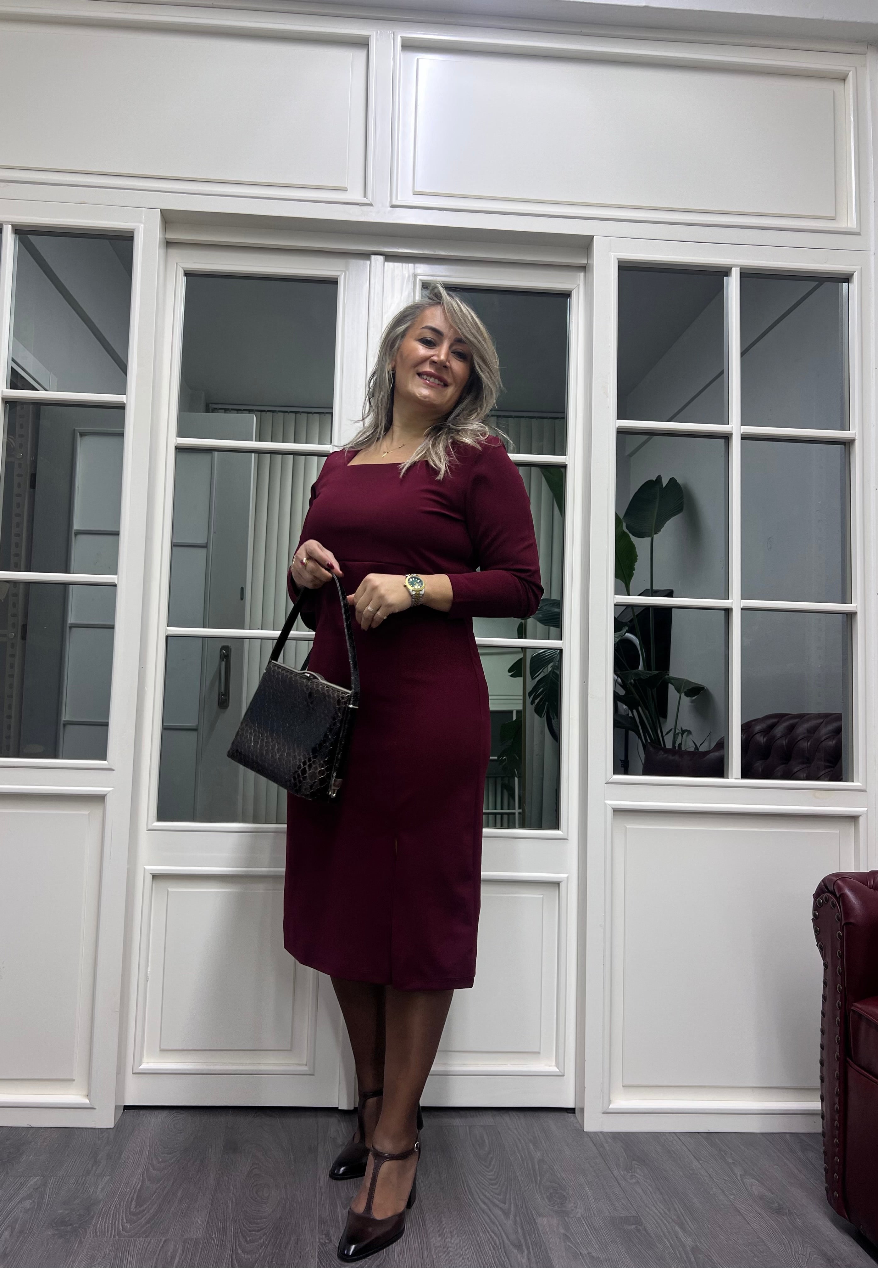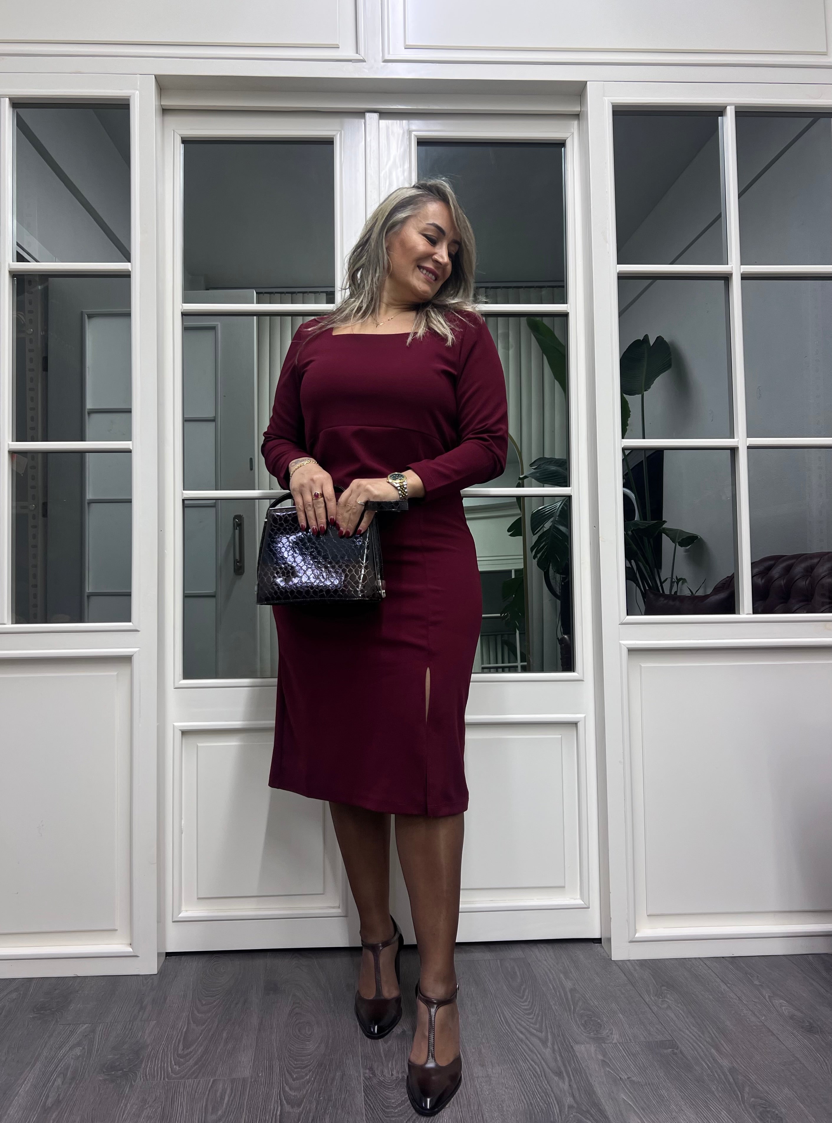 A02167 bordo kare yaka likralı yırtmaçlı elbise
