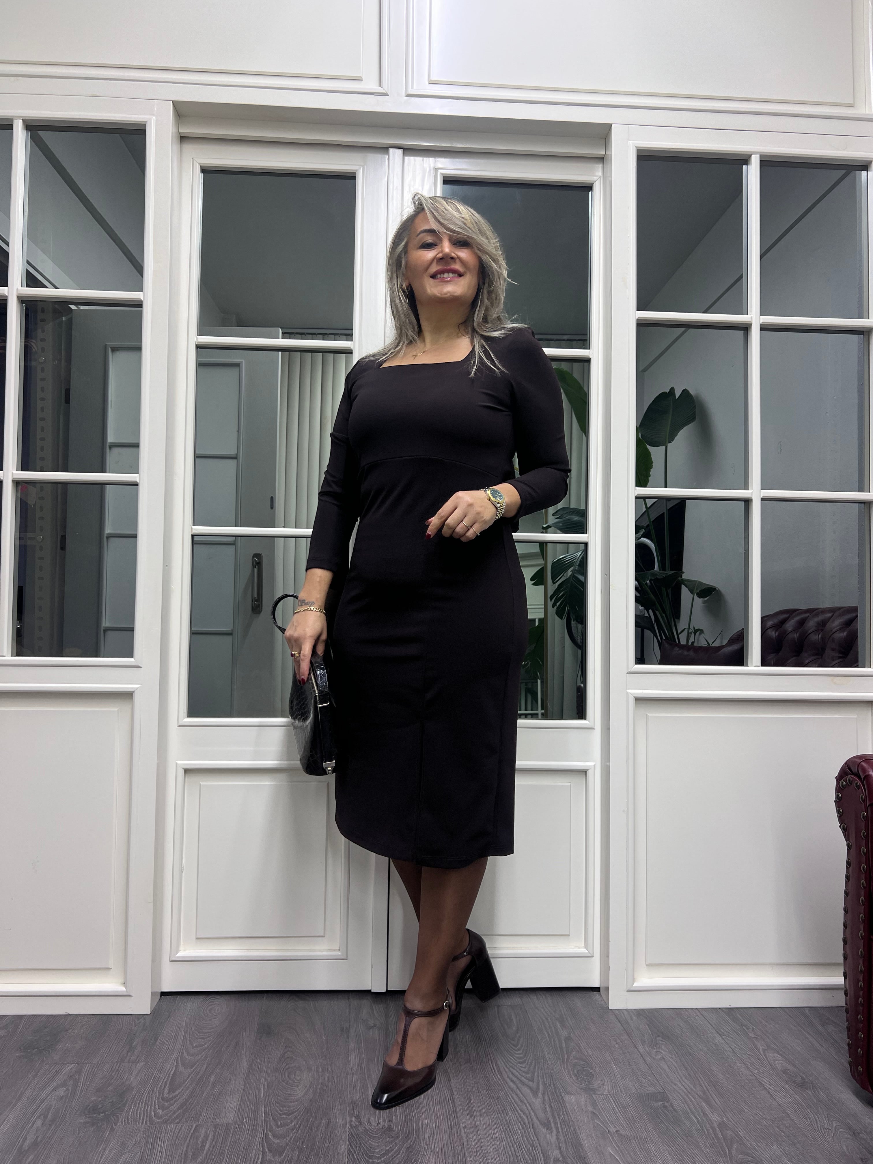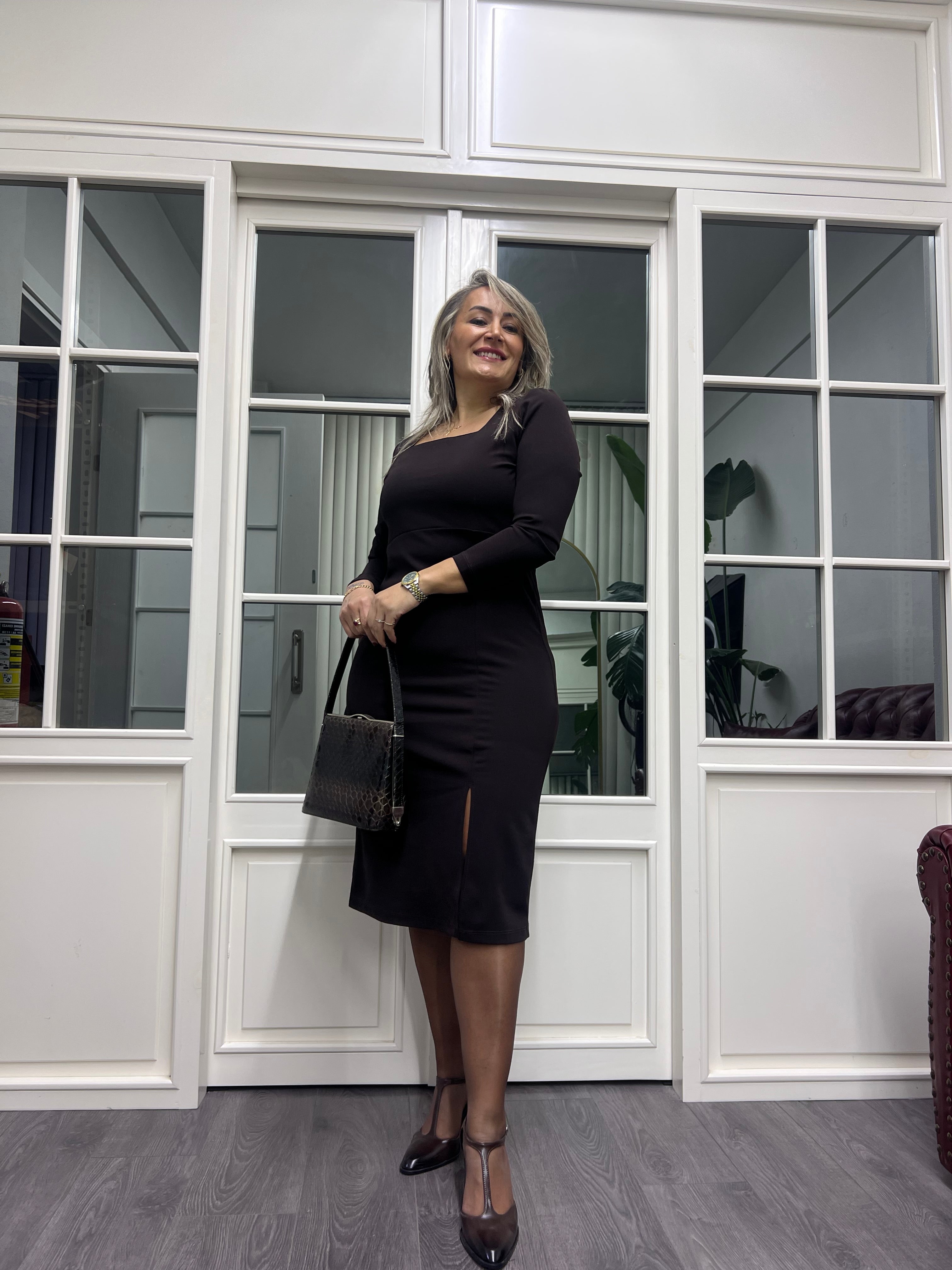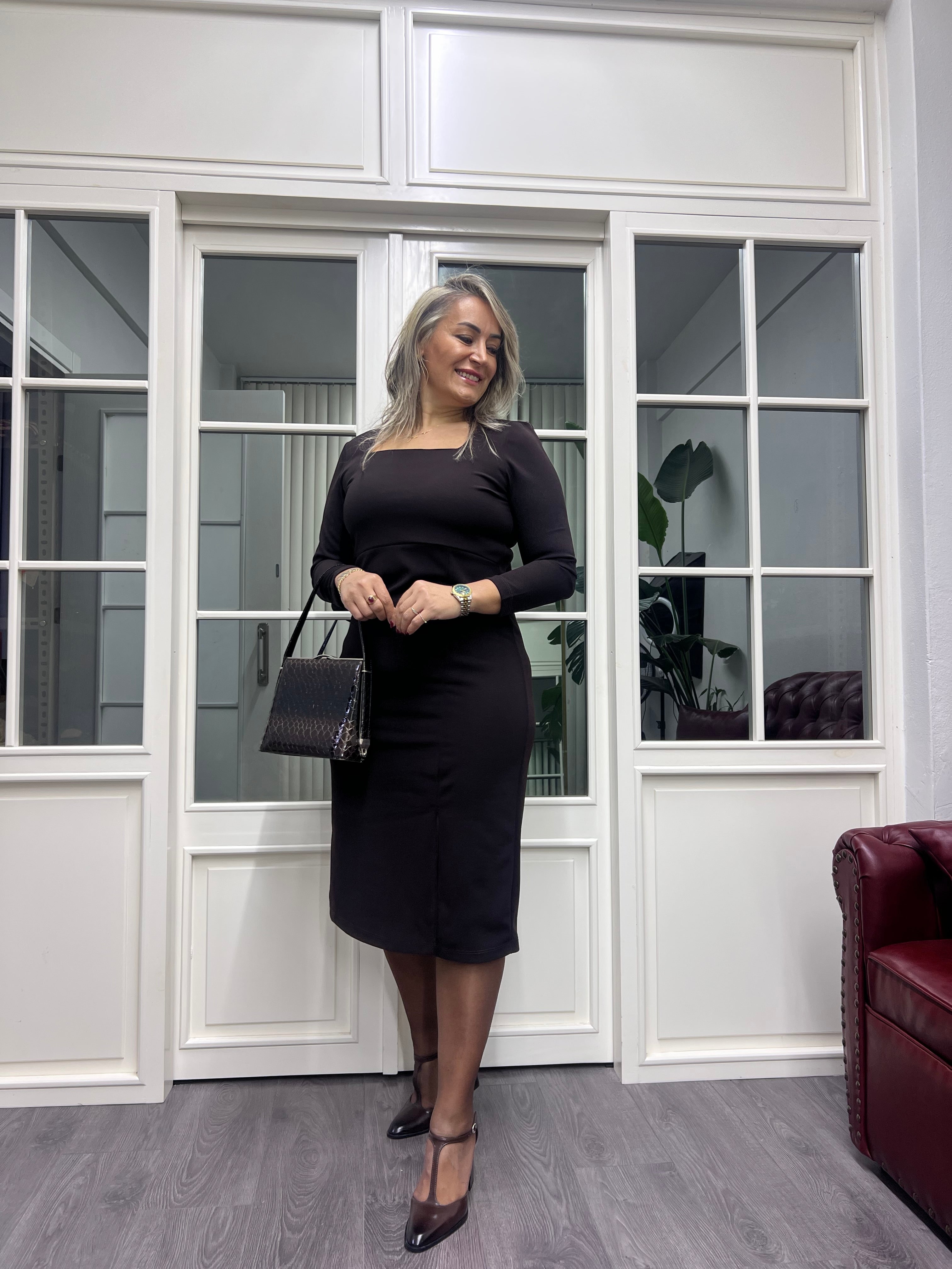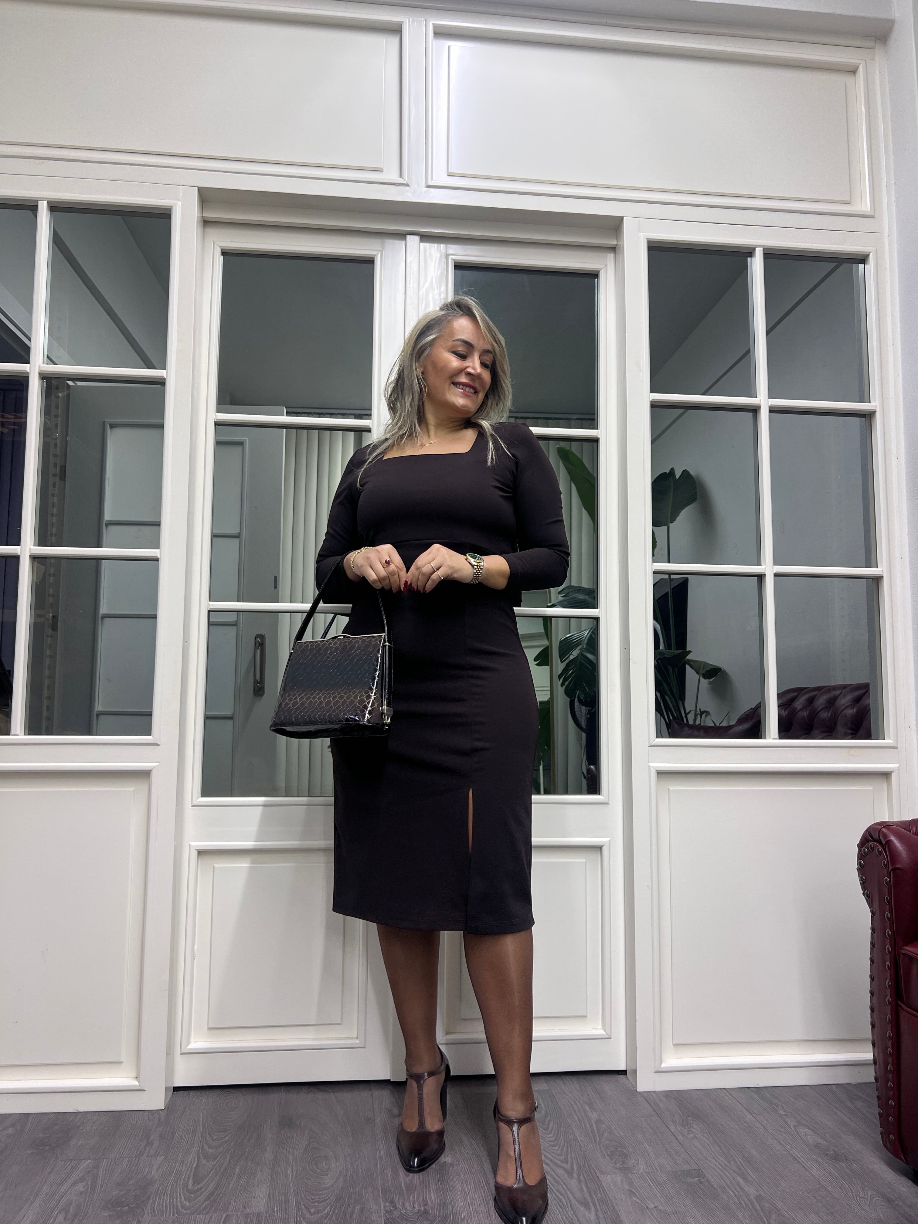 A02168 kare yaka lilralı yırtmaçlı elbise