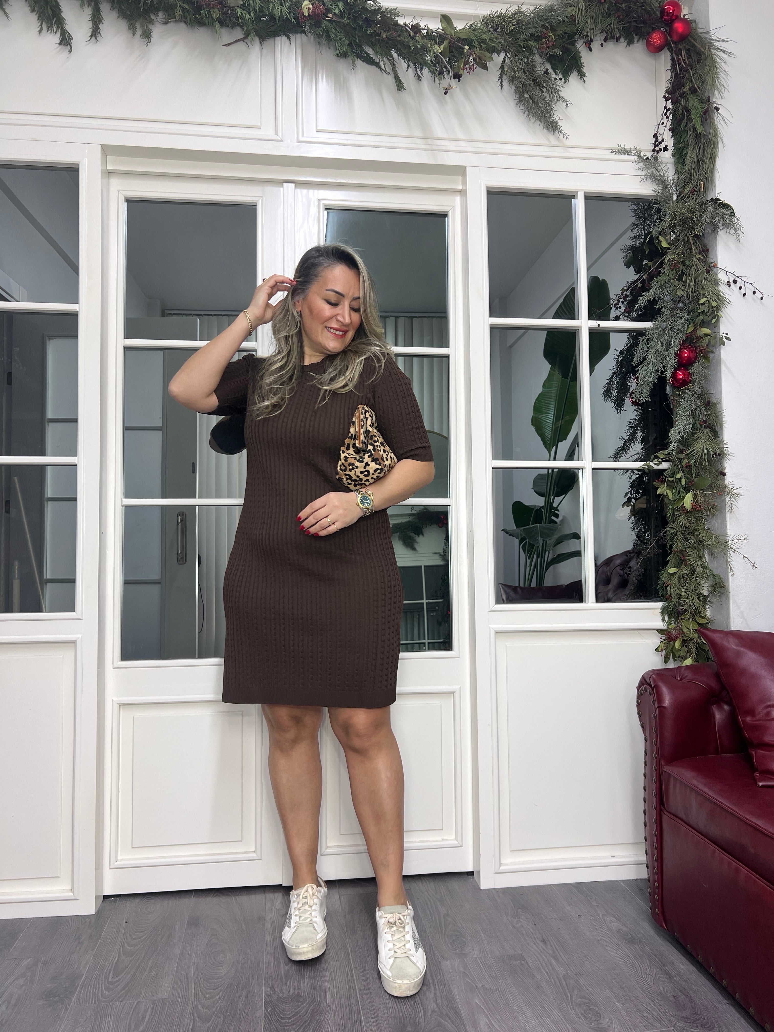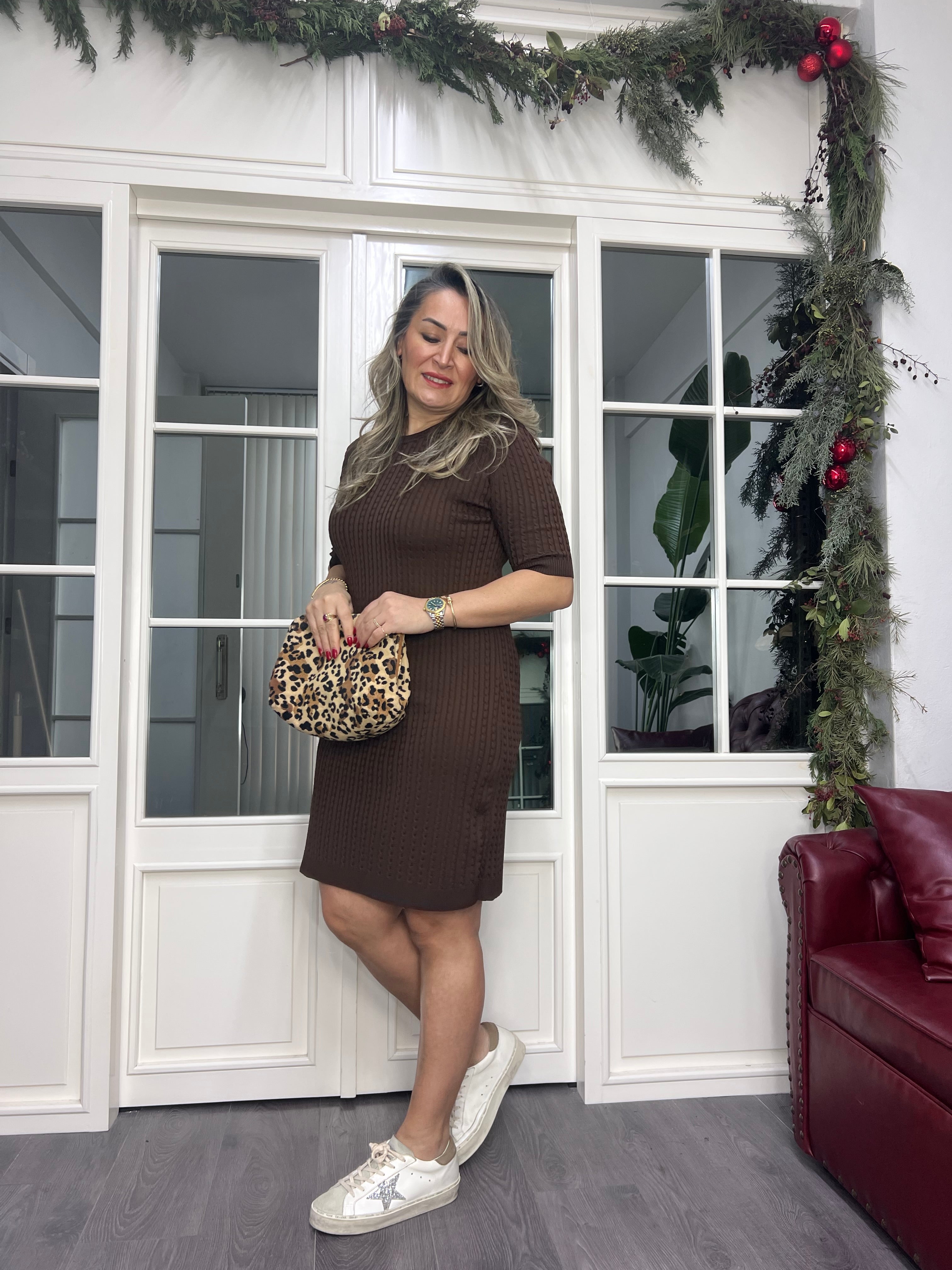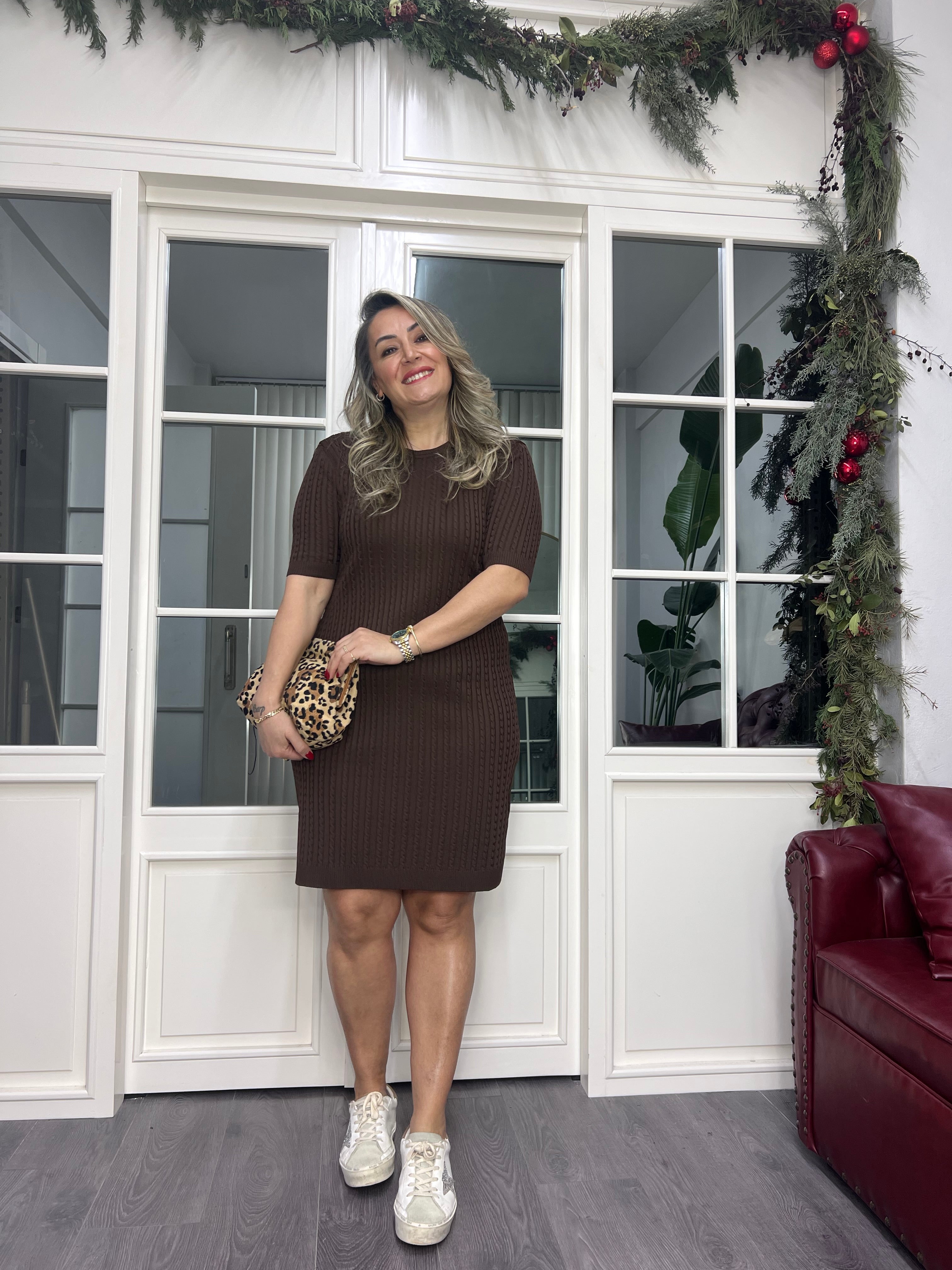 A02322 kahve örgü desen triko elbise