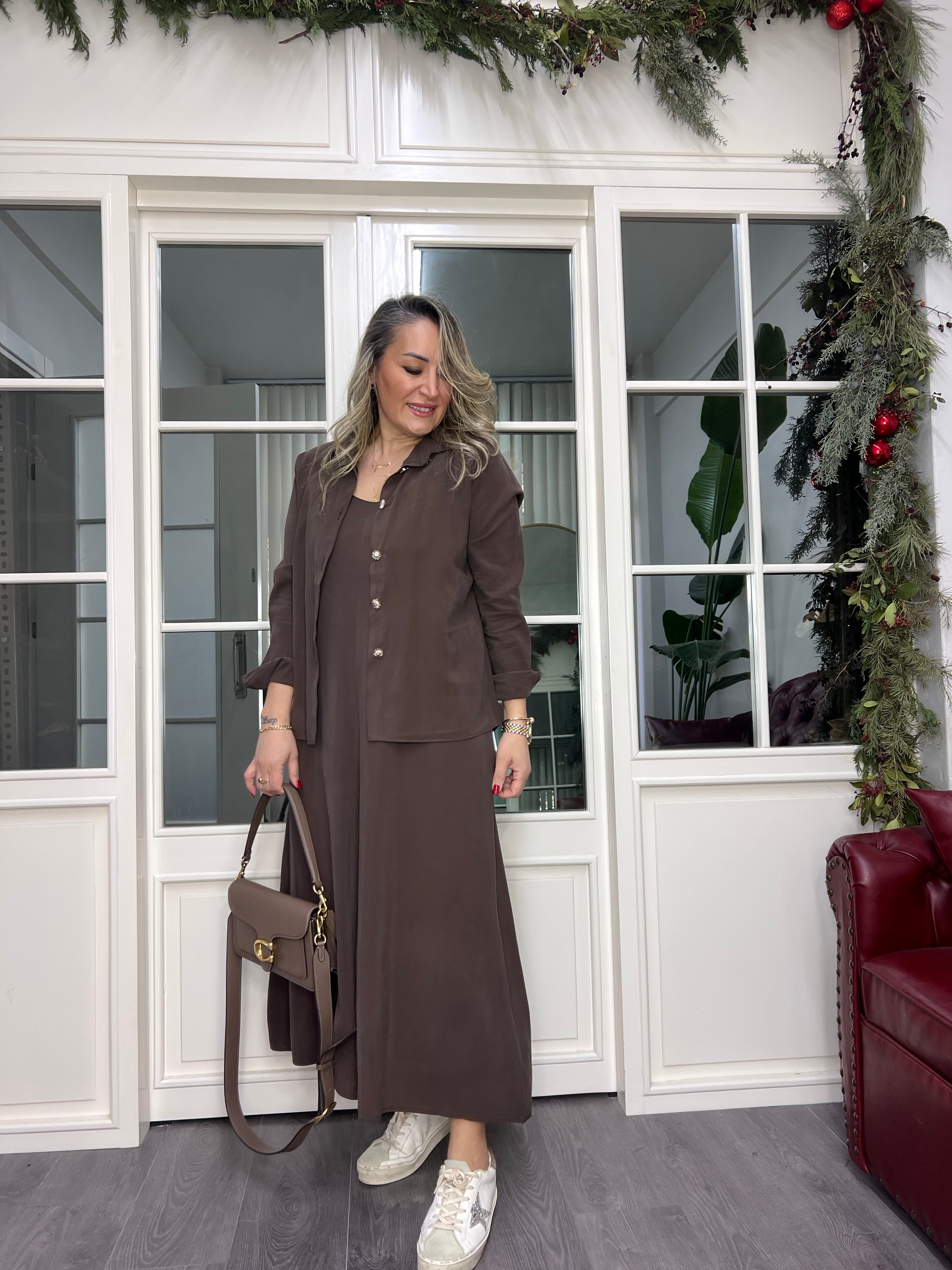 A02341 kahve tensel kumaş gömlek elbise