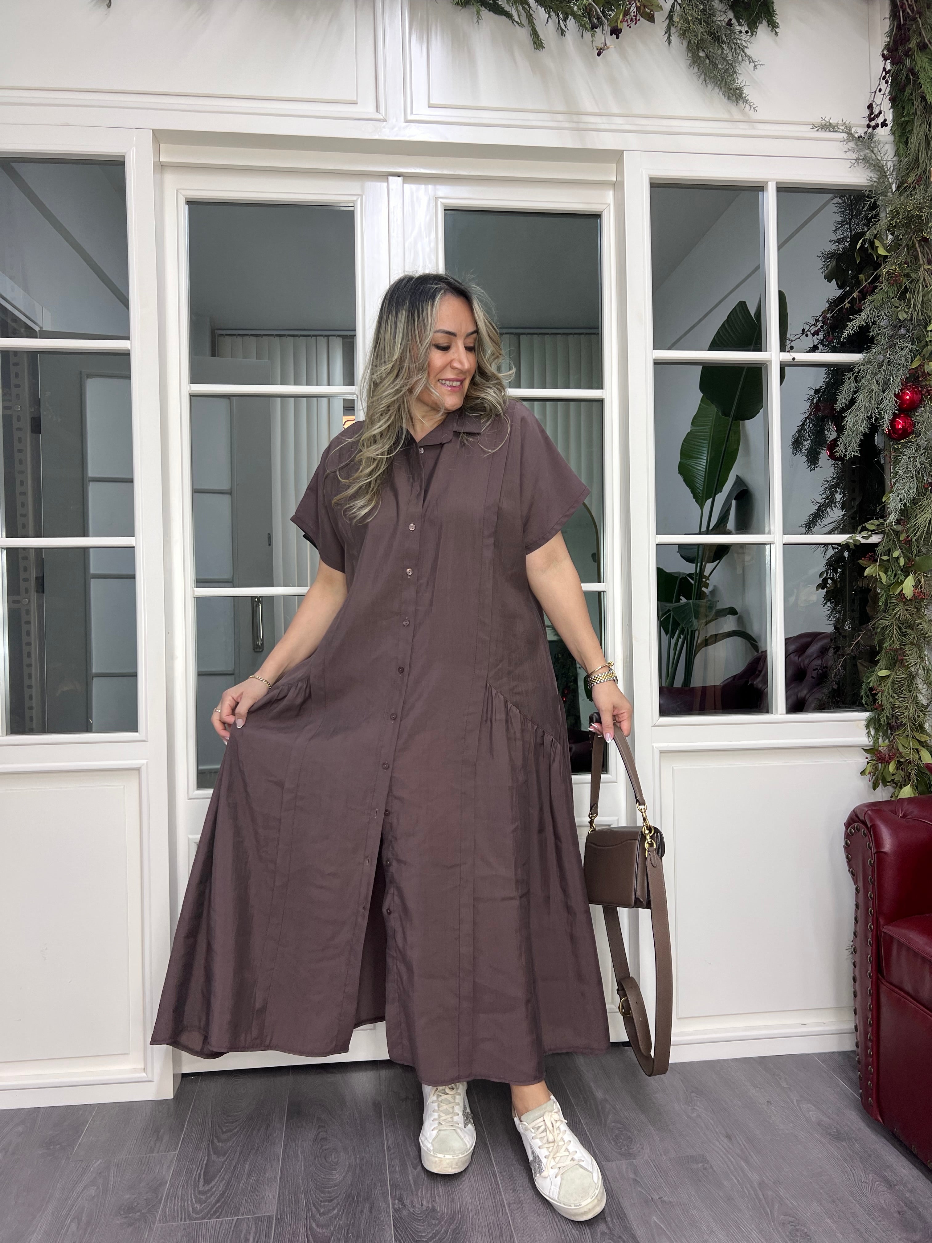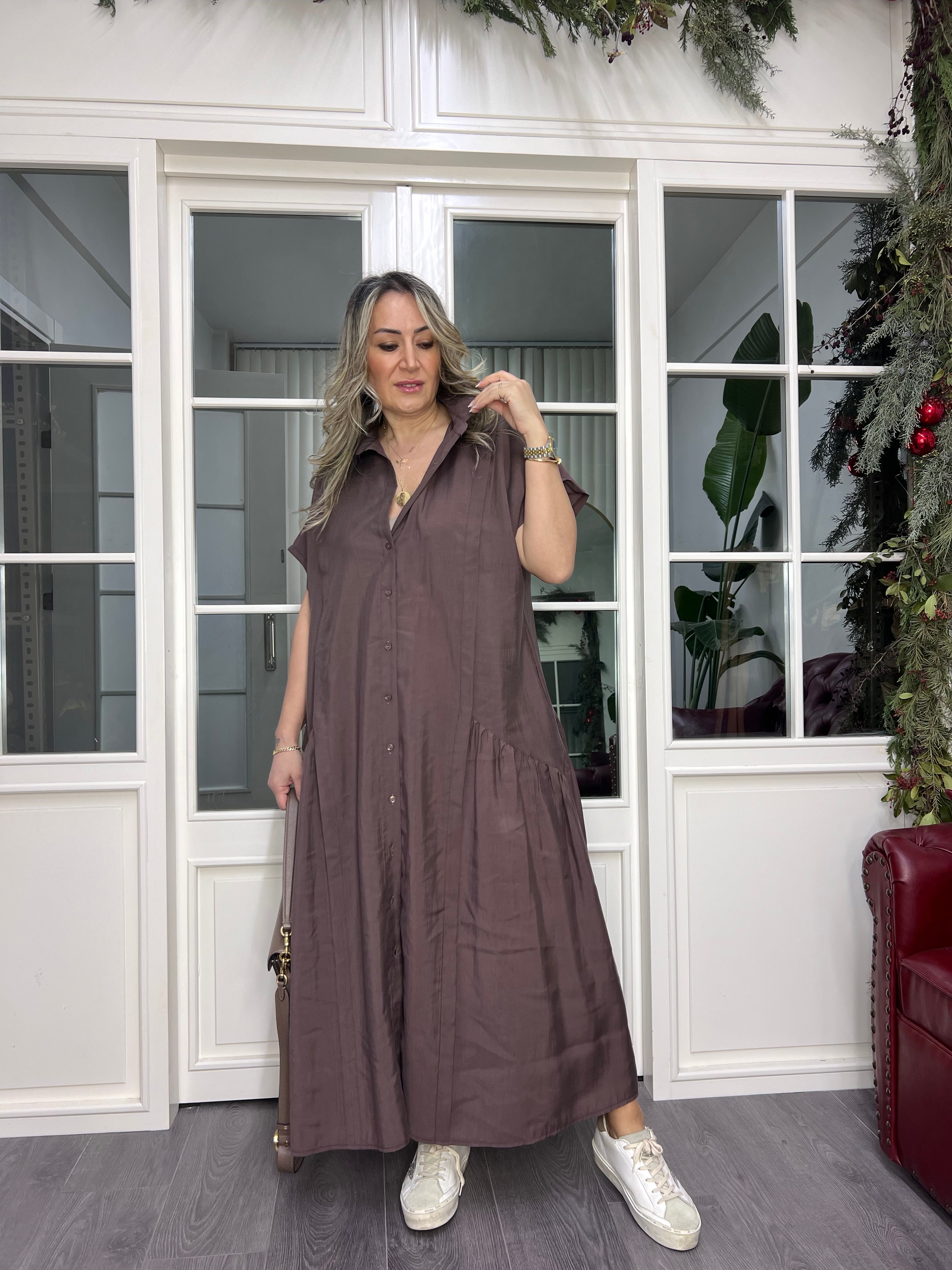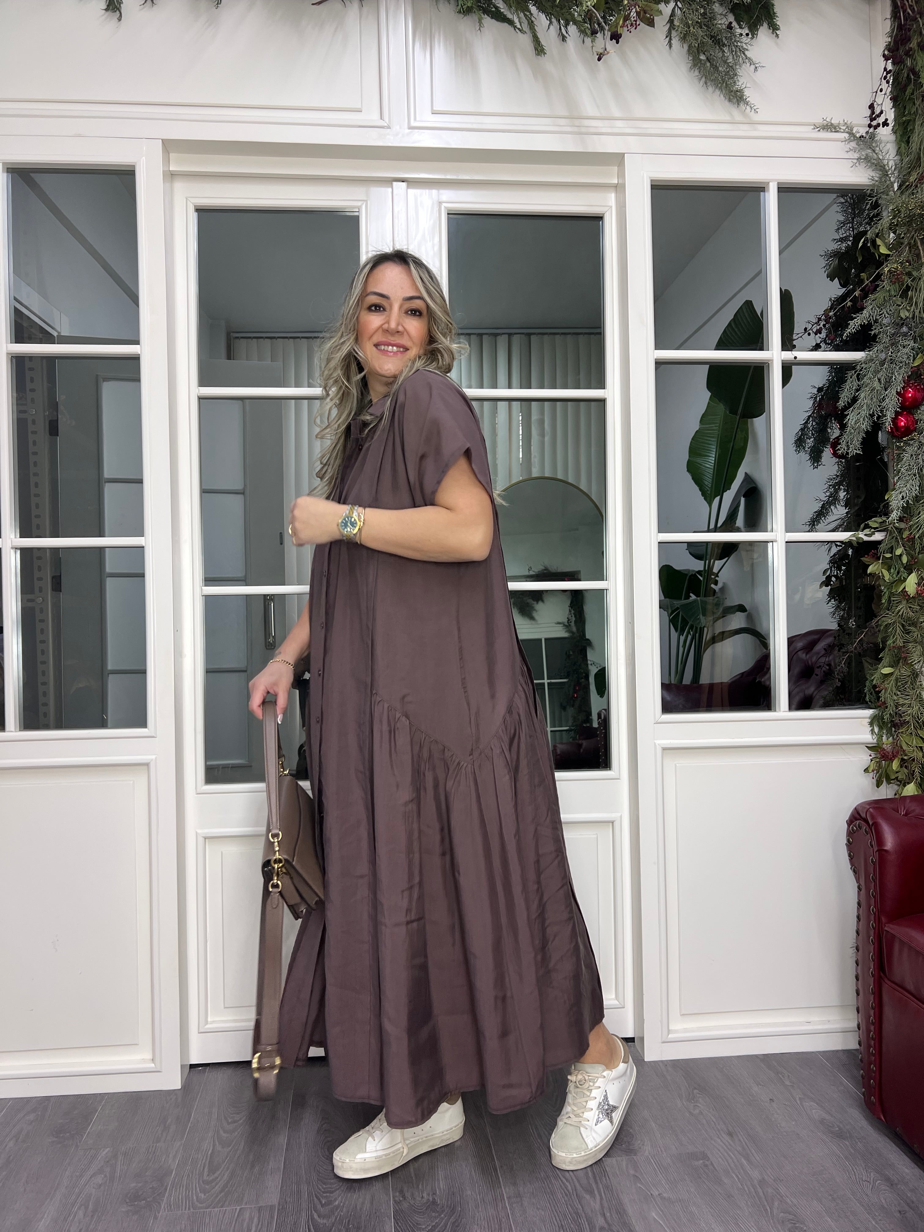 A02351 kahve tensel kumaş bol düğmeli elbise
