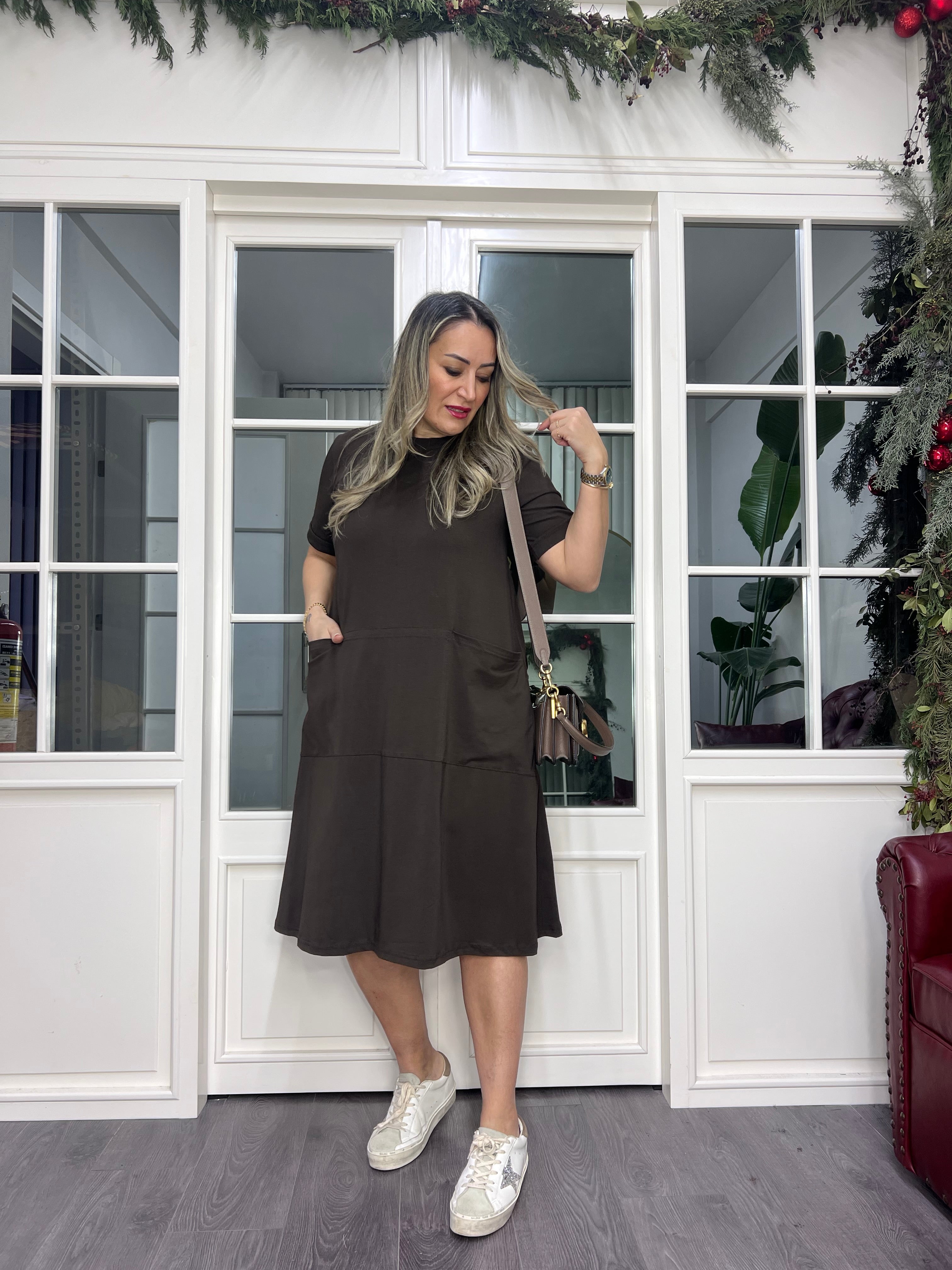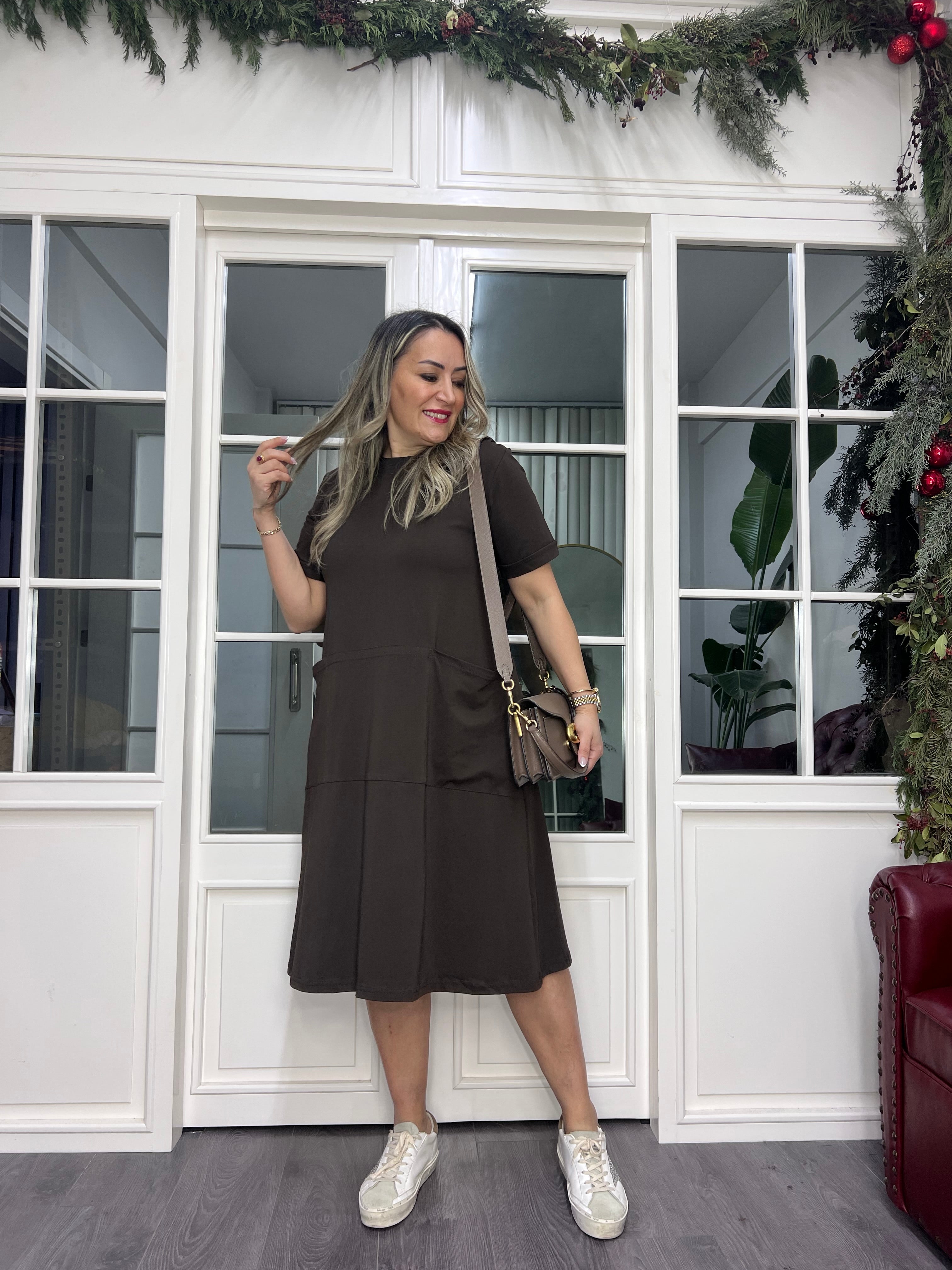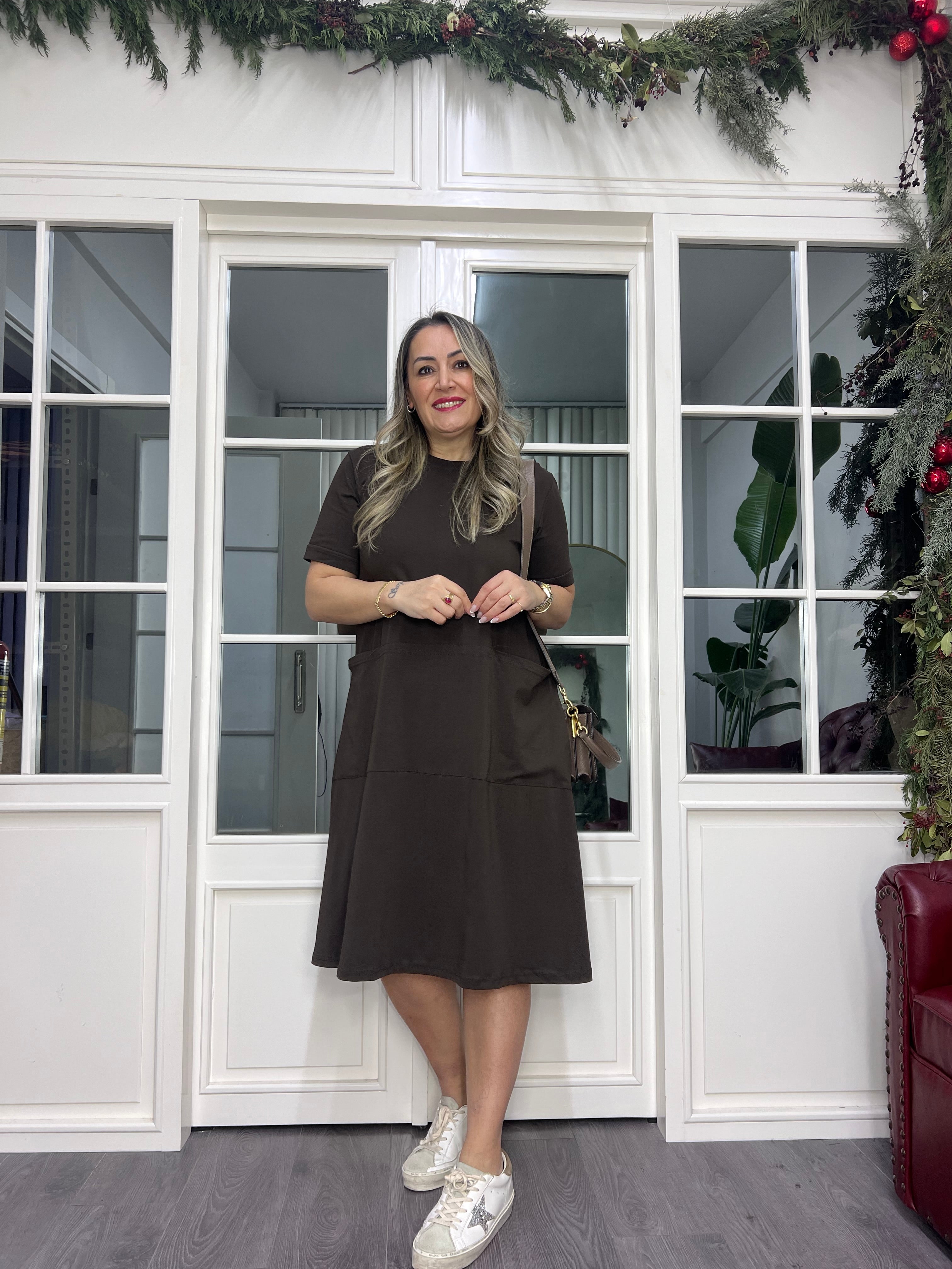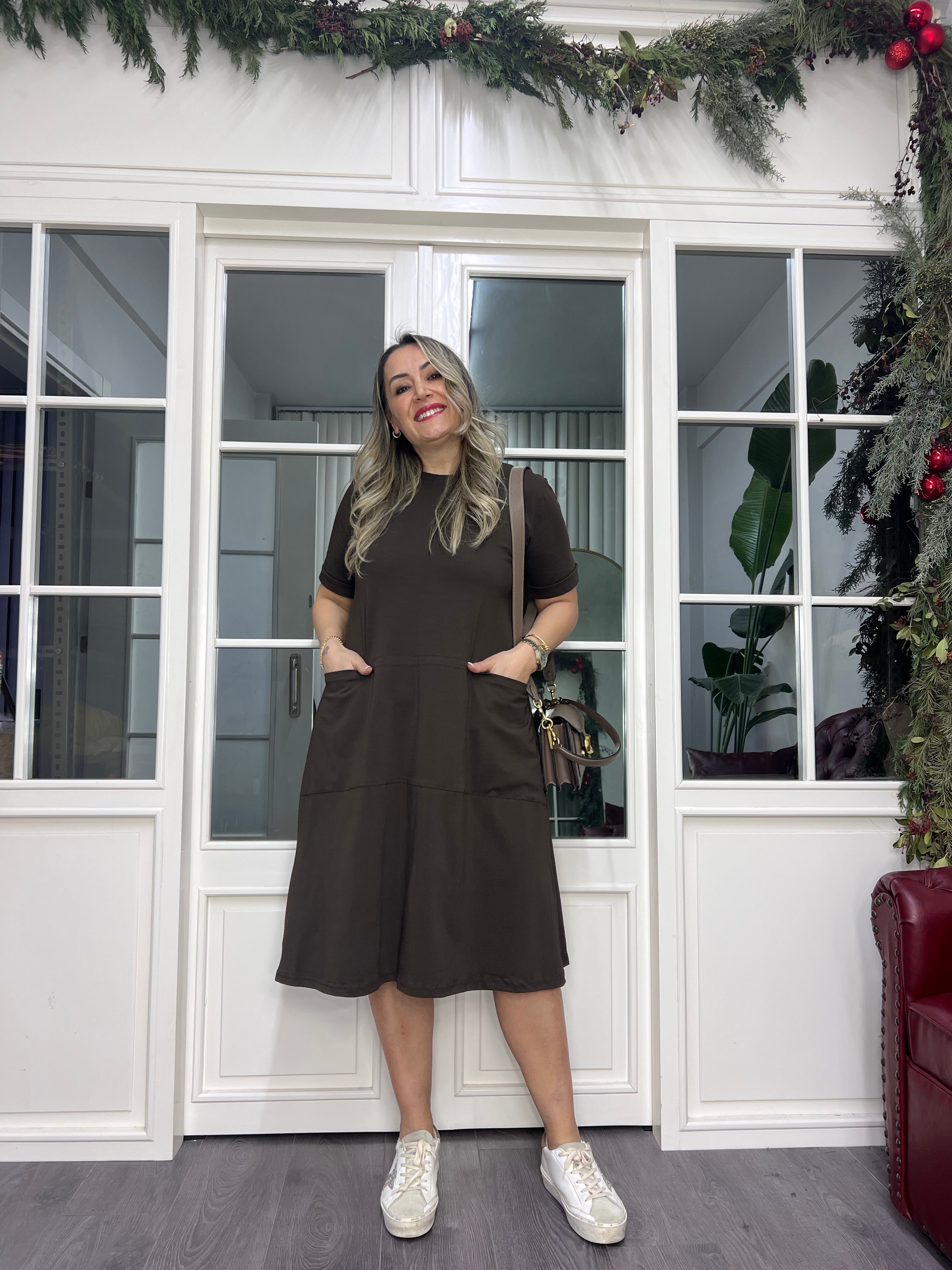 A02378 kahve likralı cepli elbise