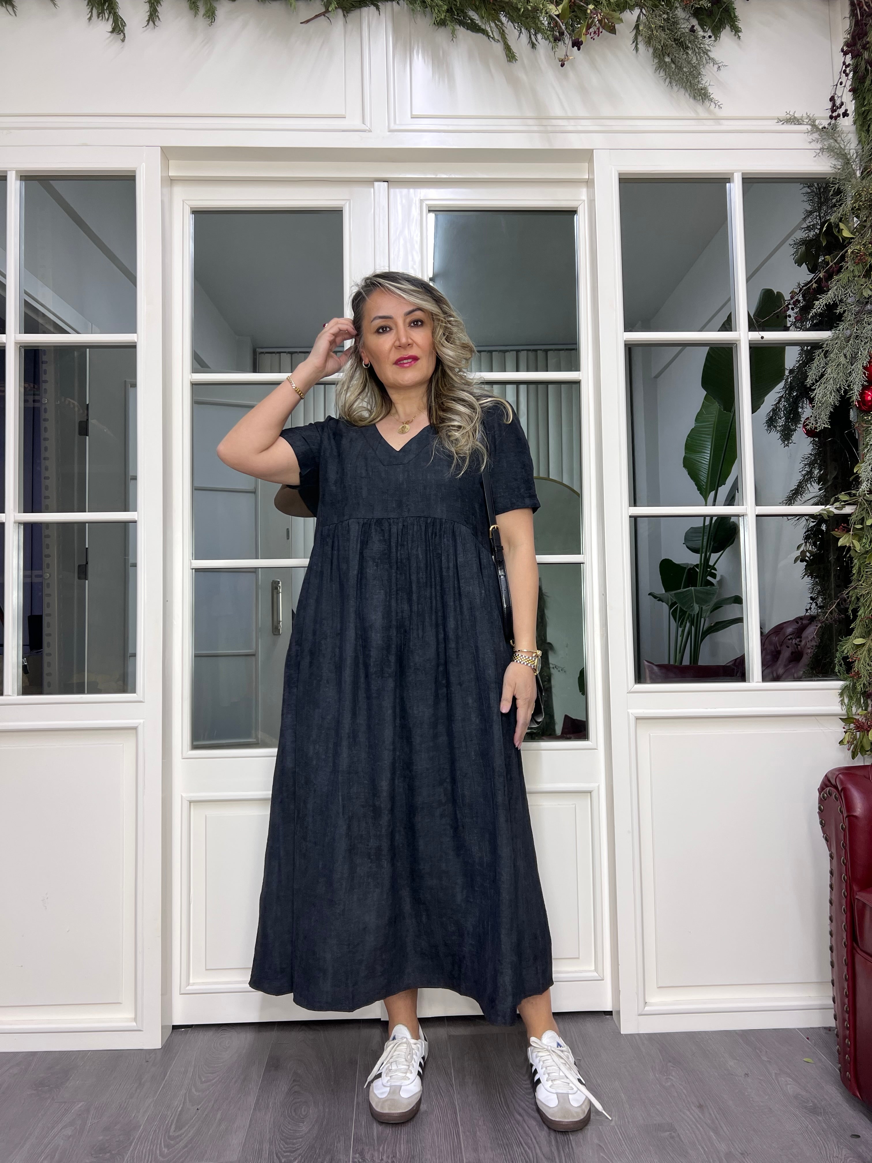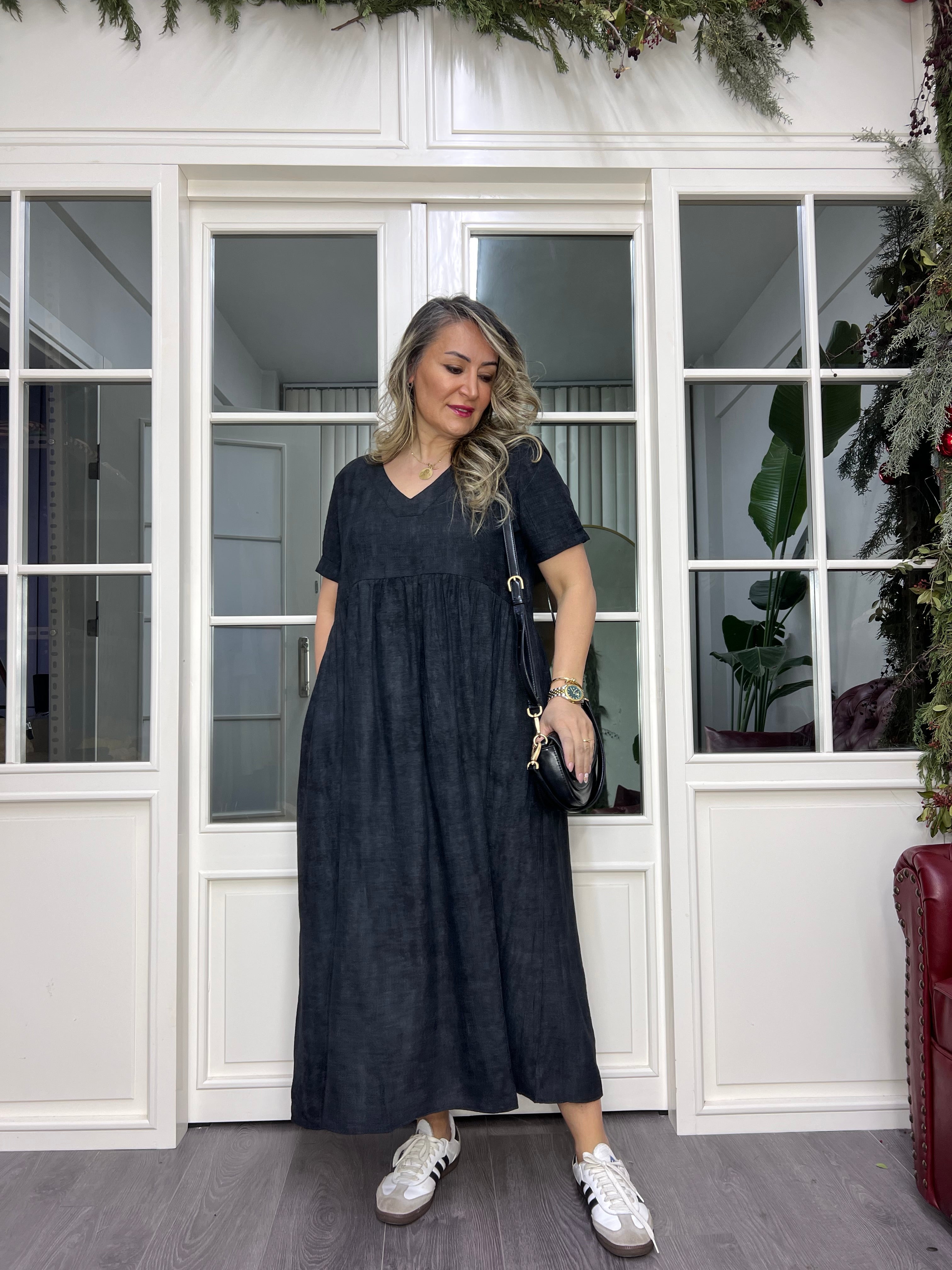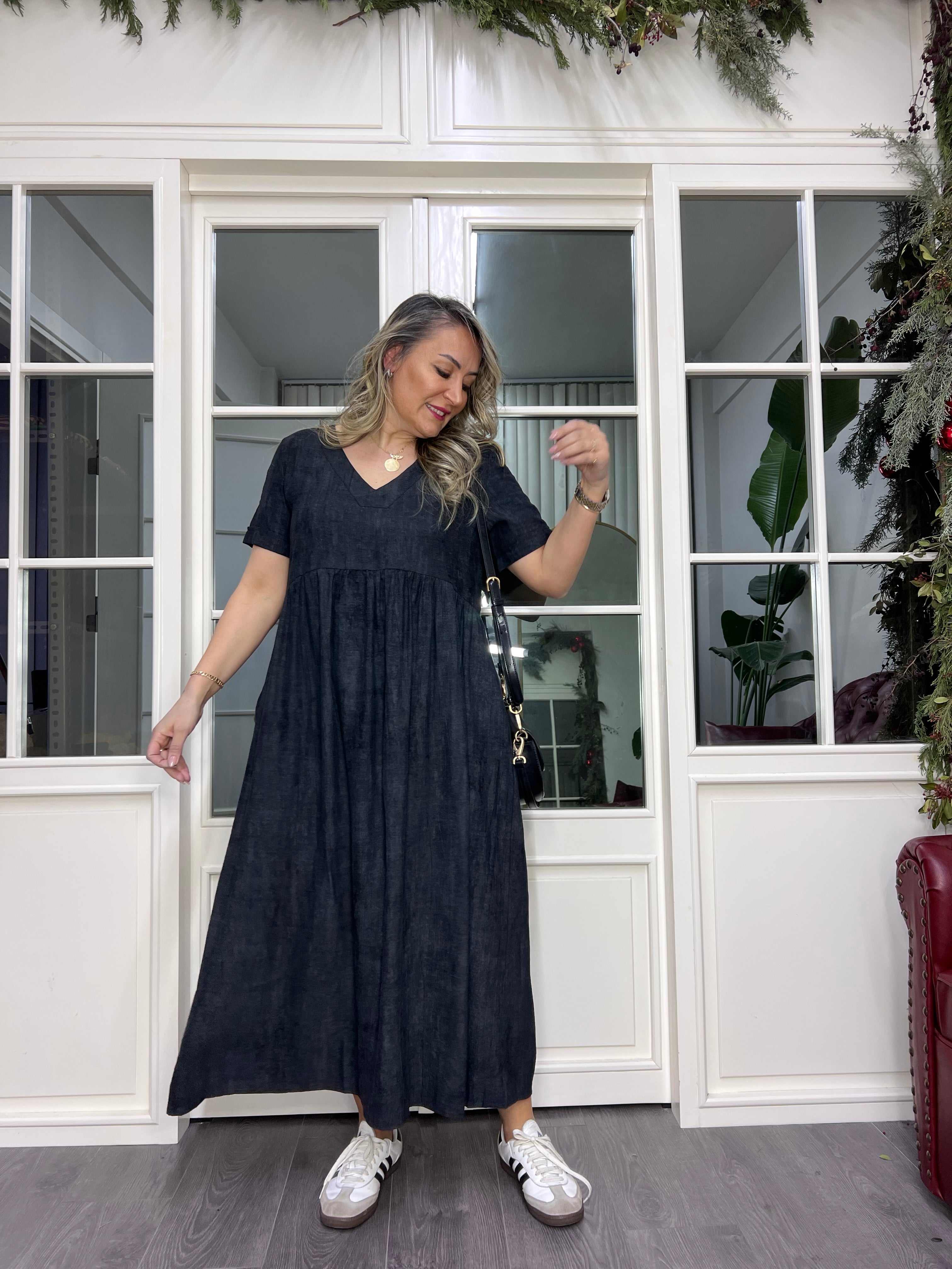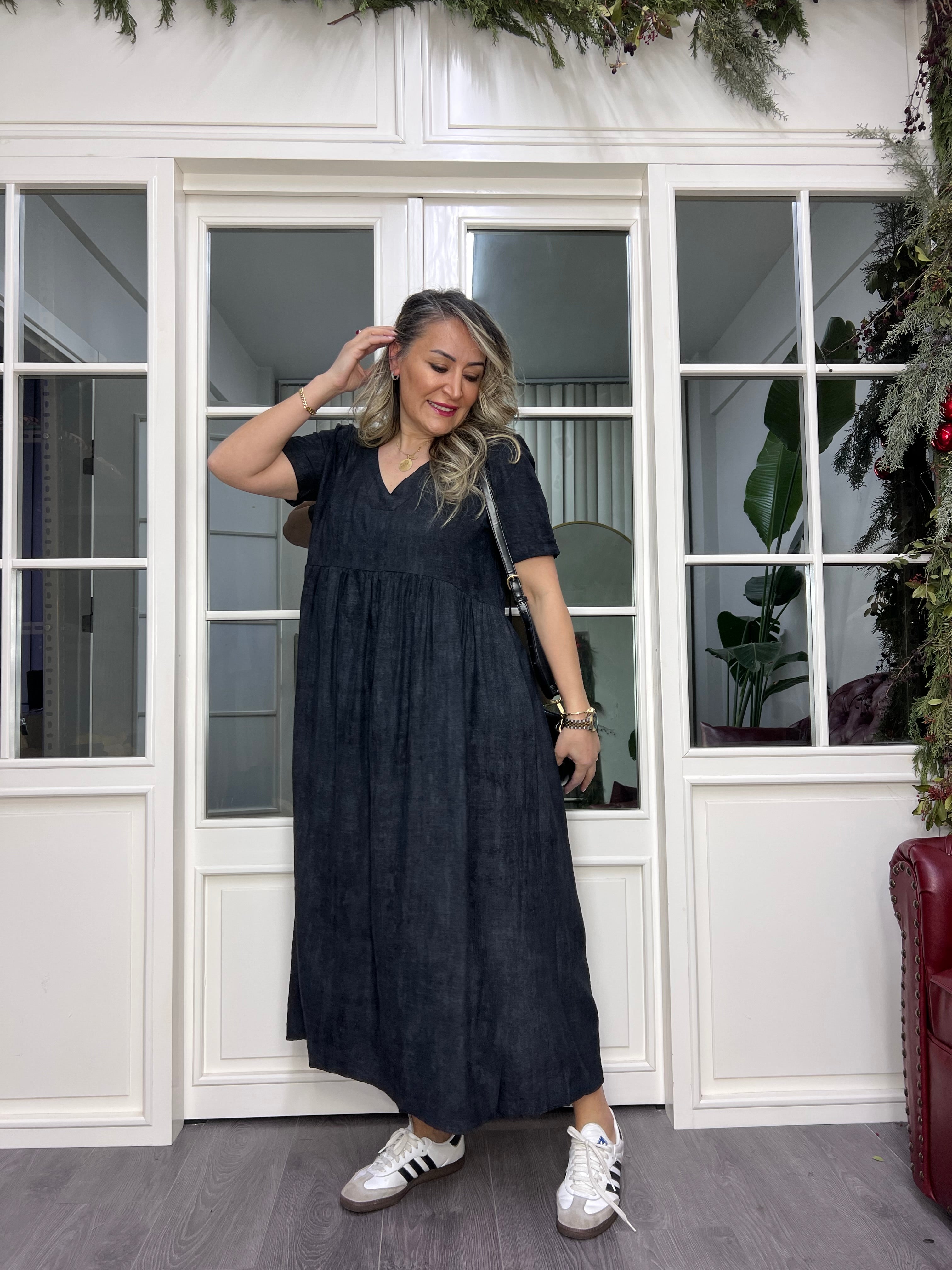 A01985 v yaka owersize dükümlü maxi elbise