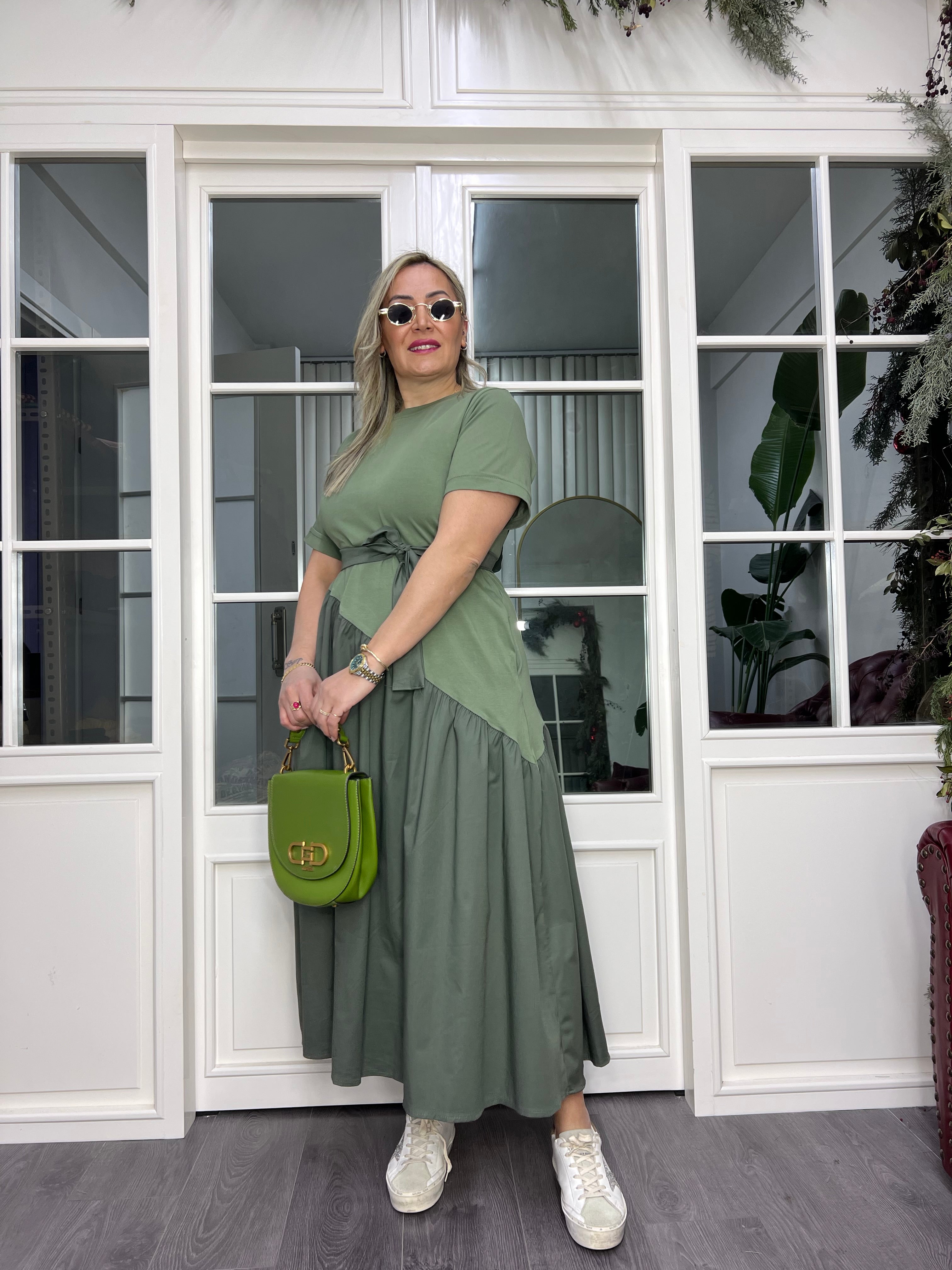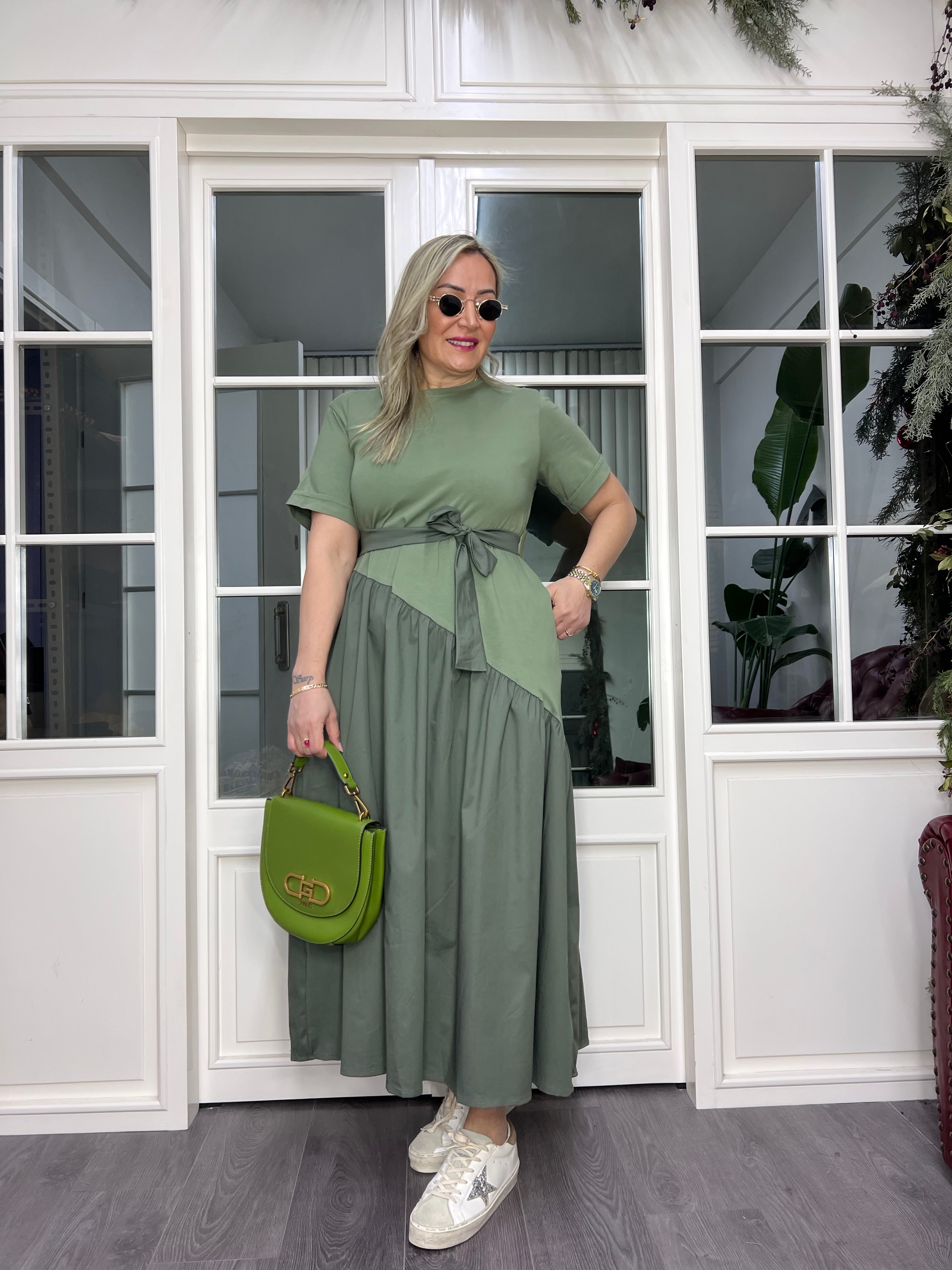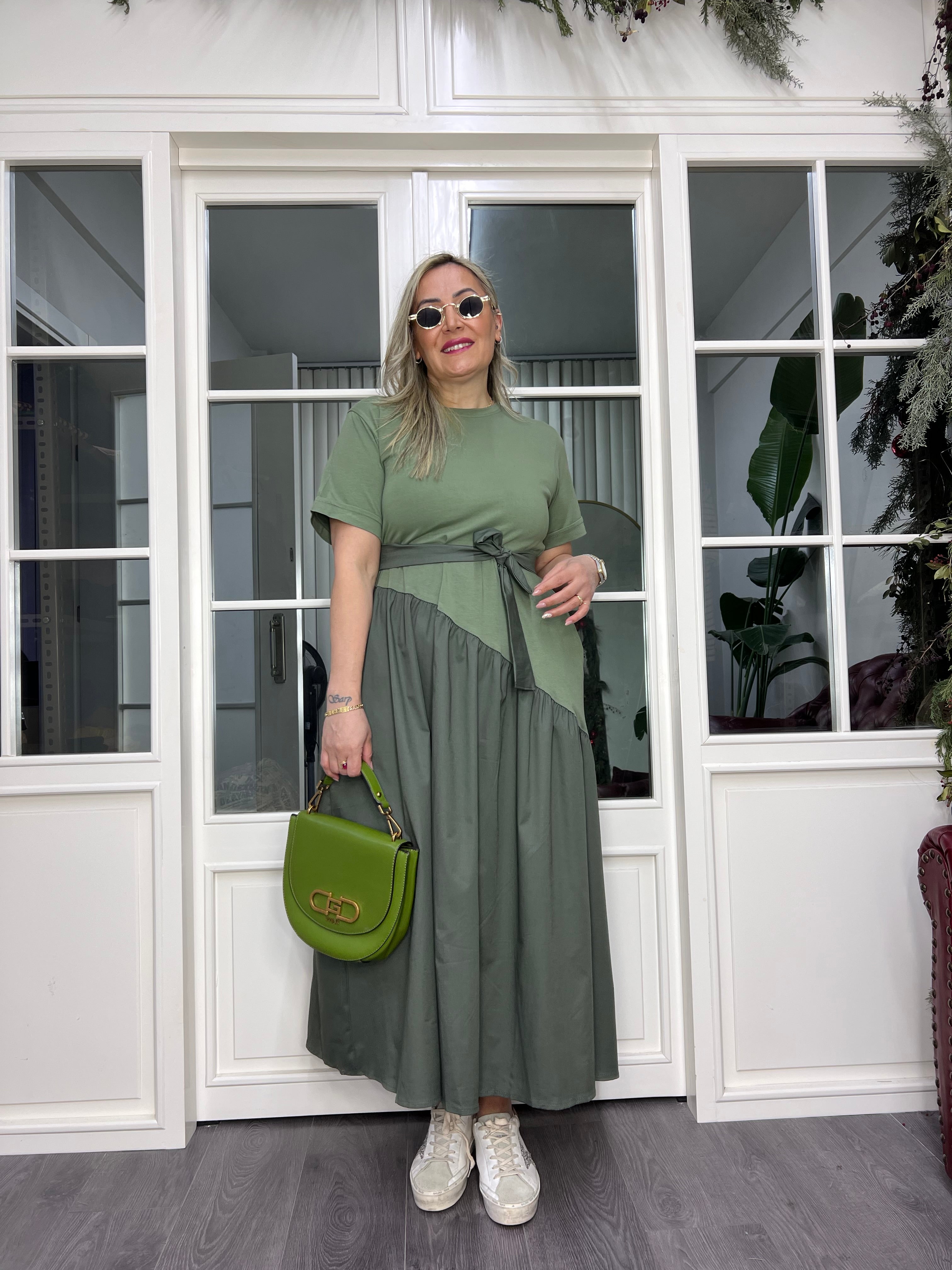 A02408 yeşil etekleri poplin bağcıklı likralı elbise
