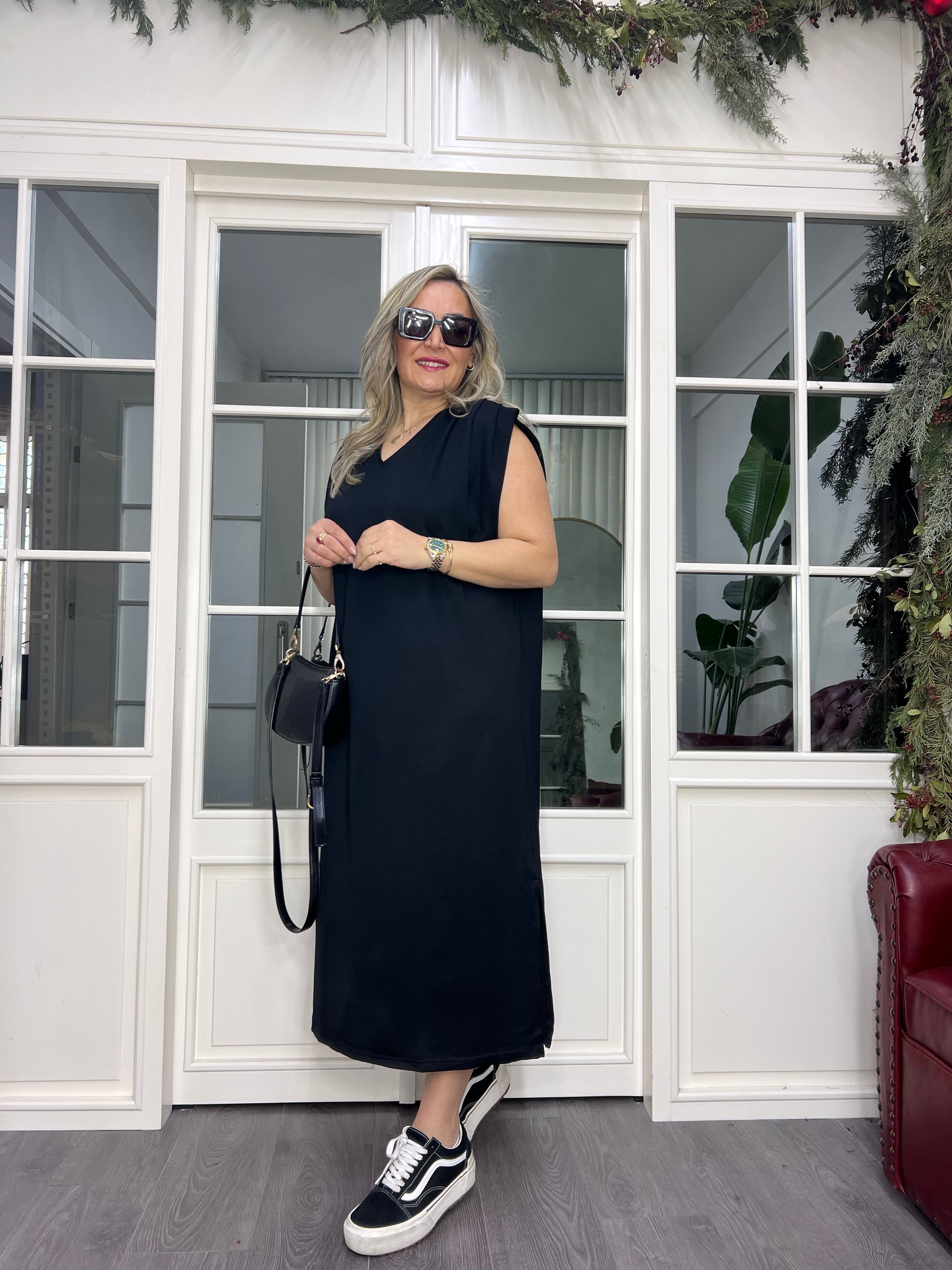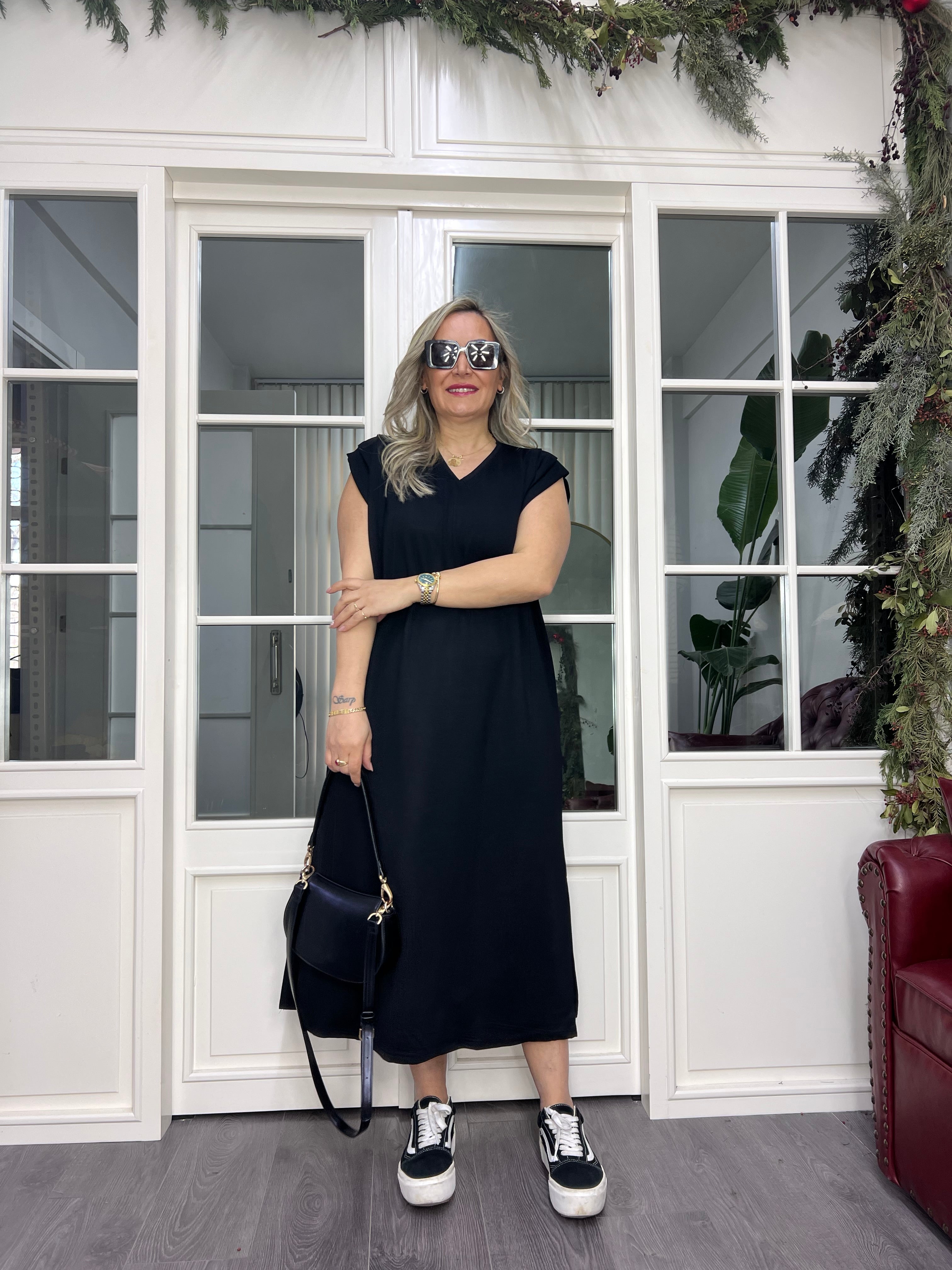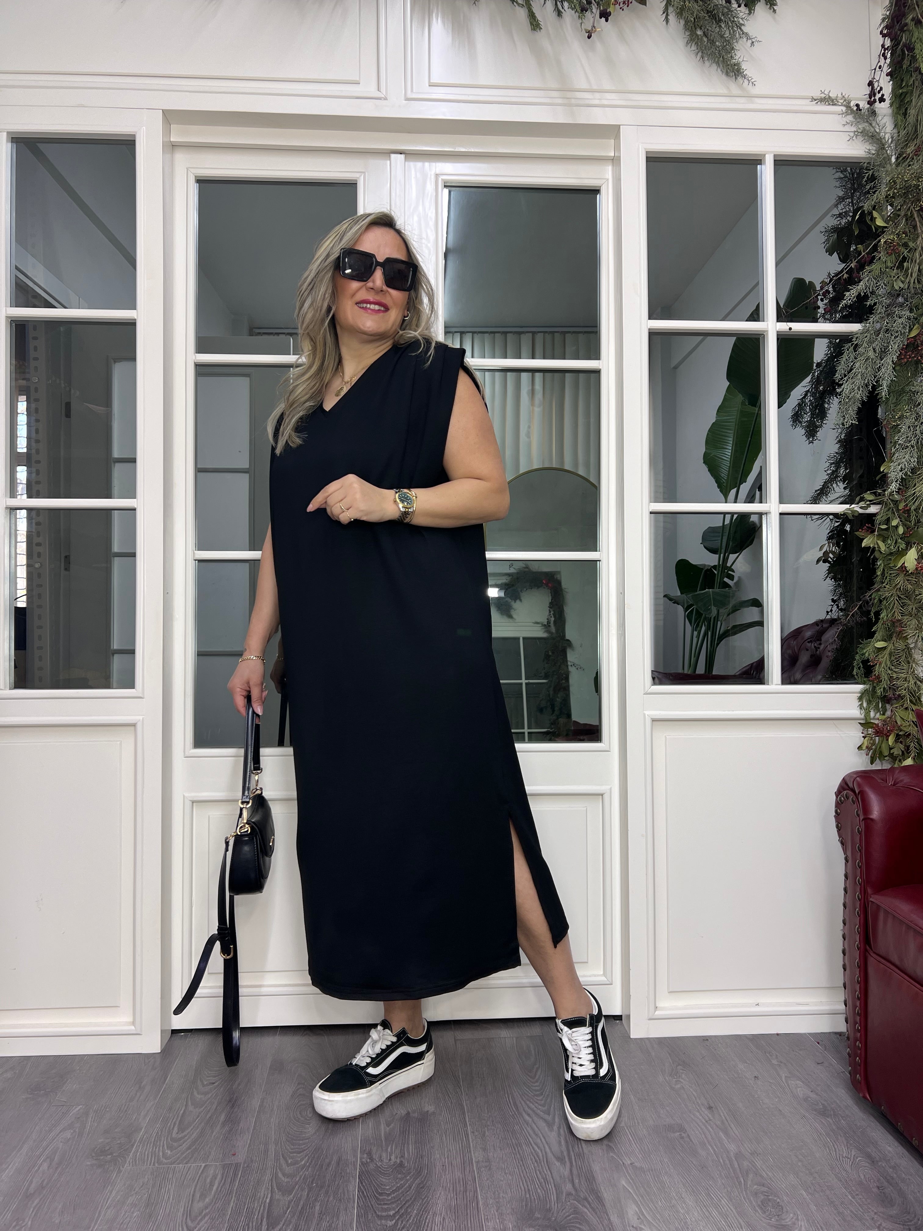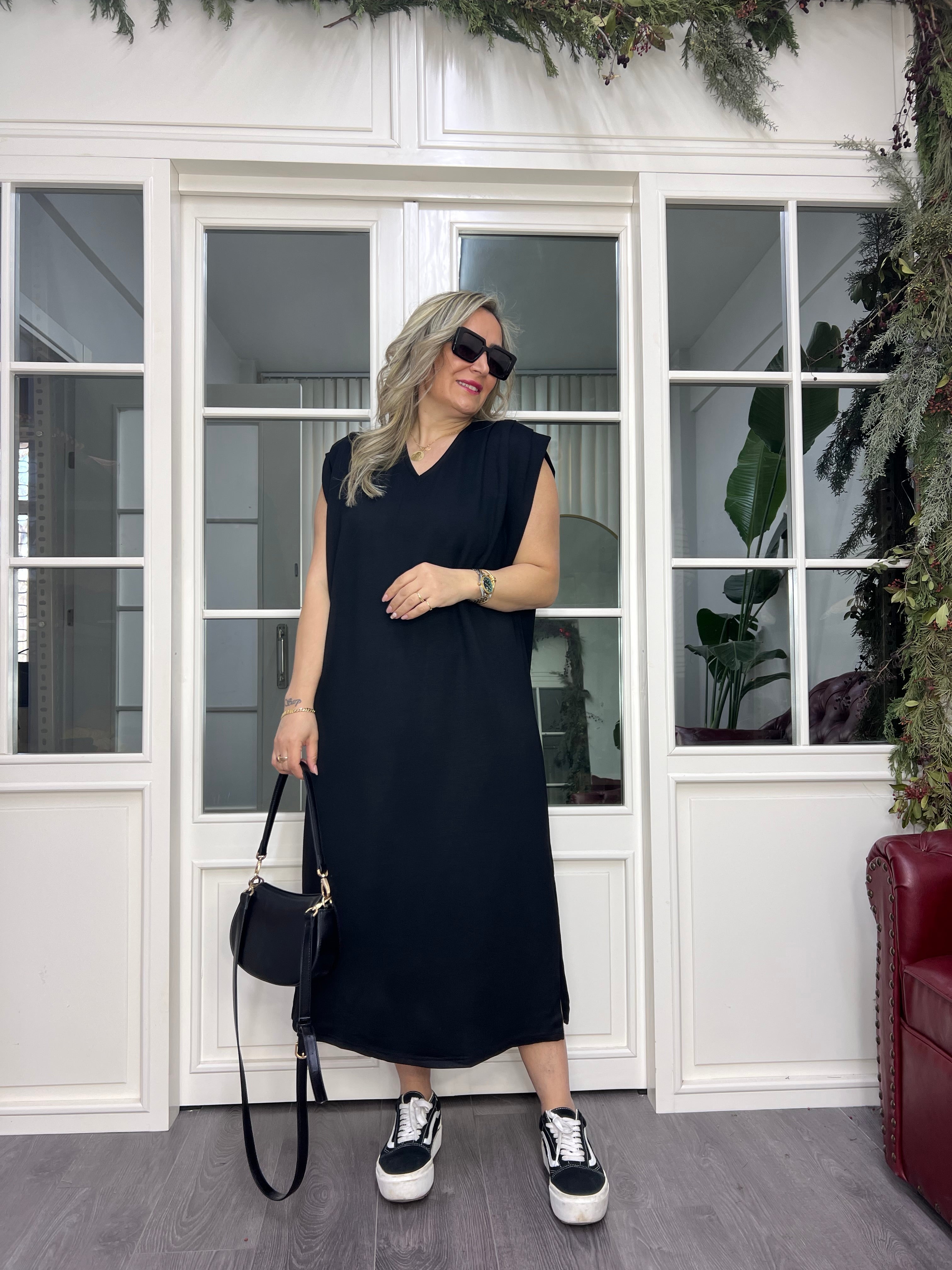 A02450 omuzları pilili yırtmaçlı modal kumaş likralı elbise