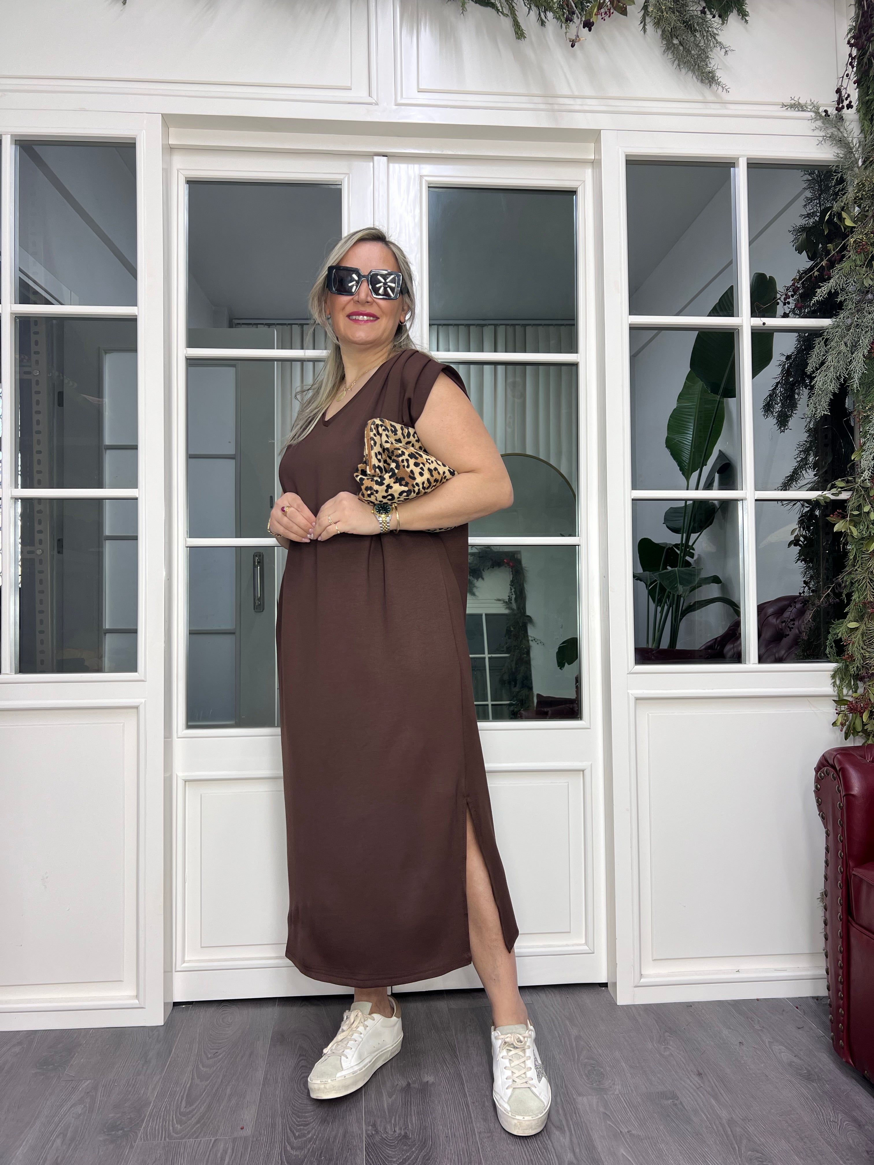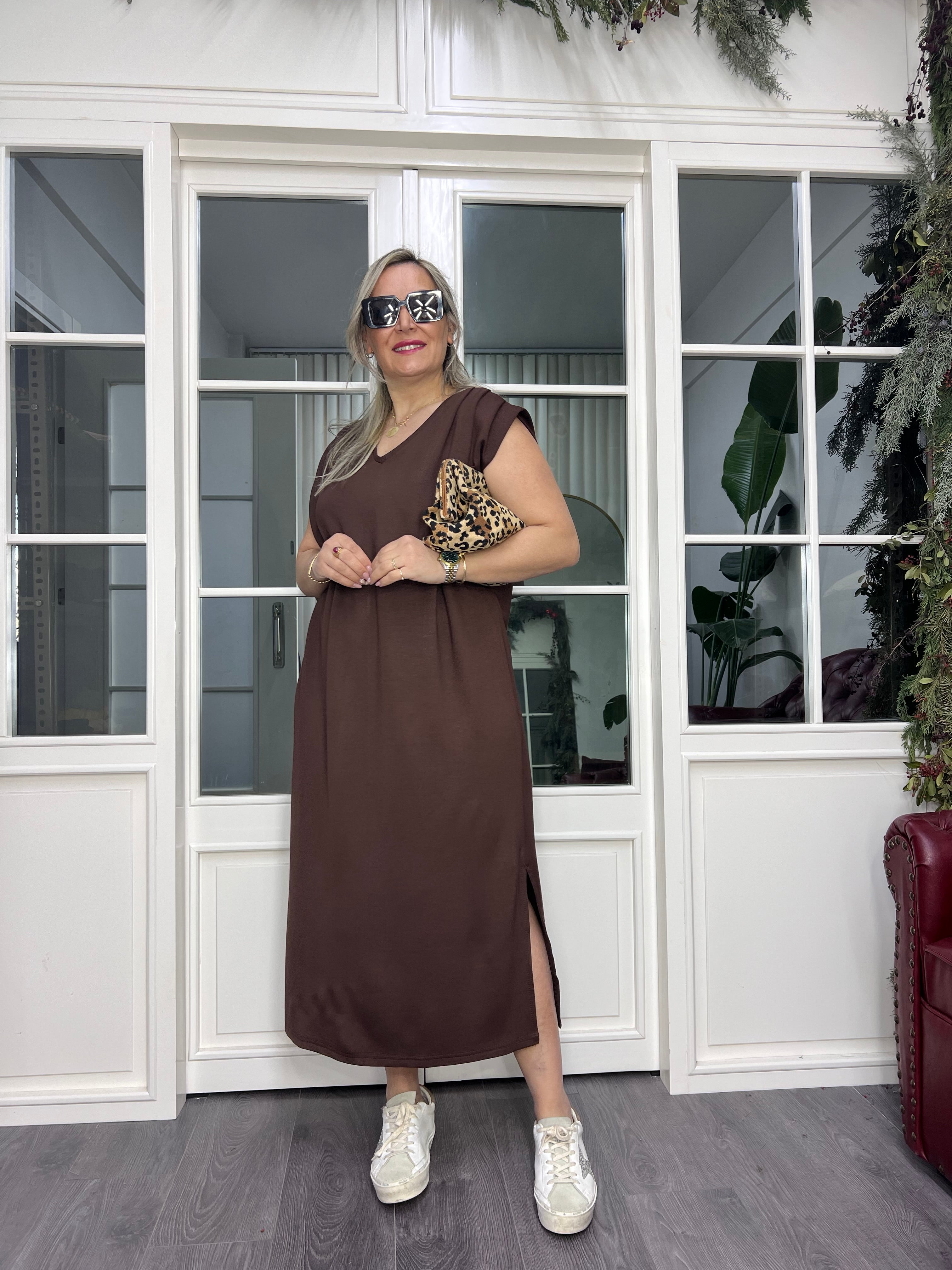 A02454 kahve likralı omuzu pilili yırtmaçlı likralı modal kumaş elbise