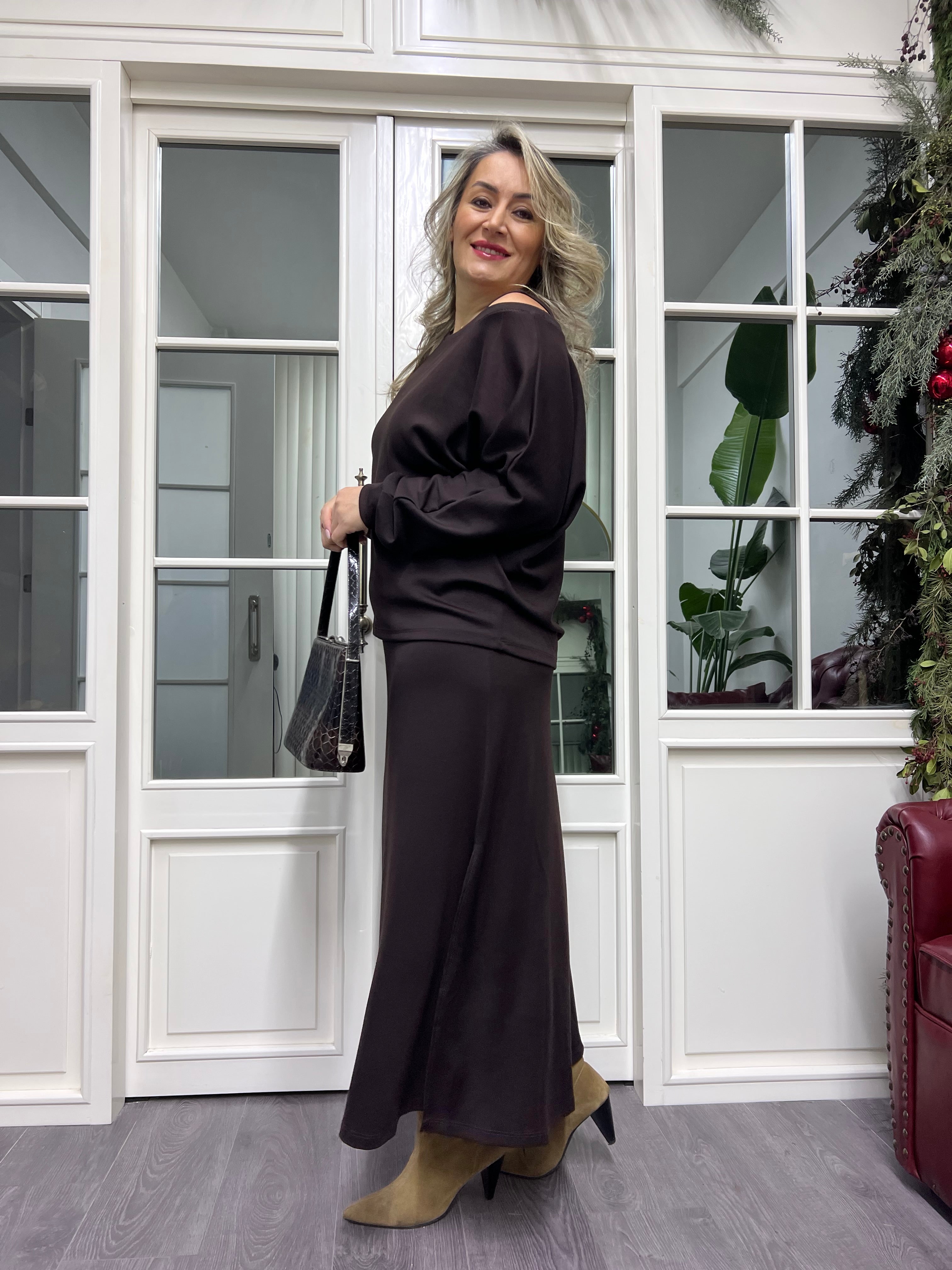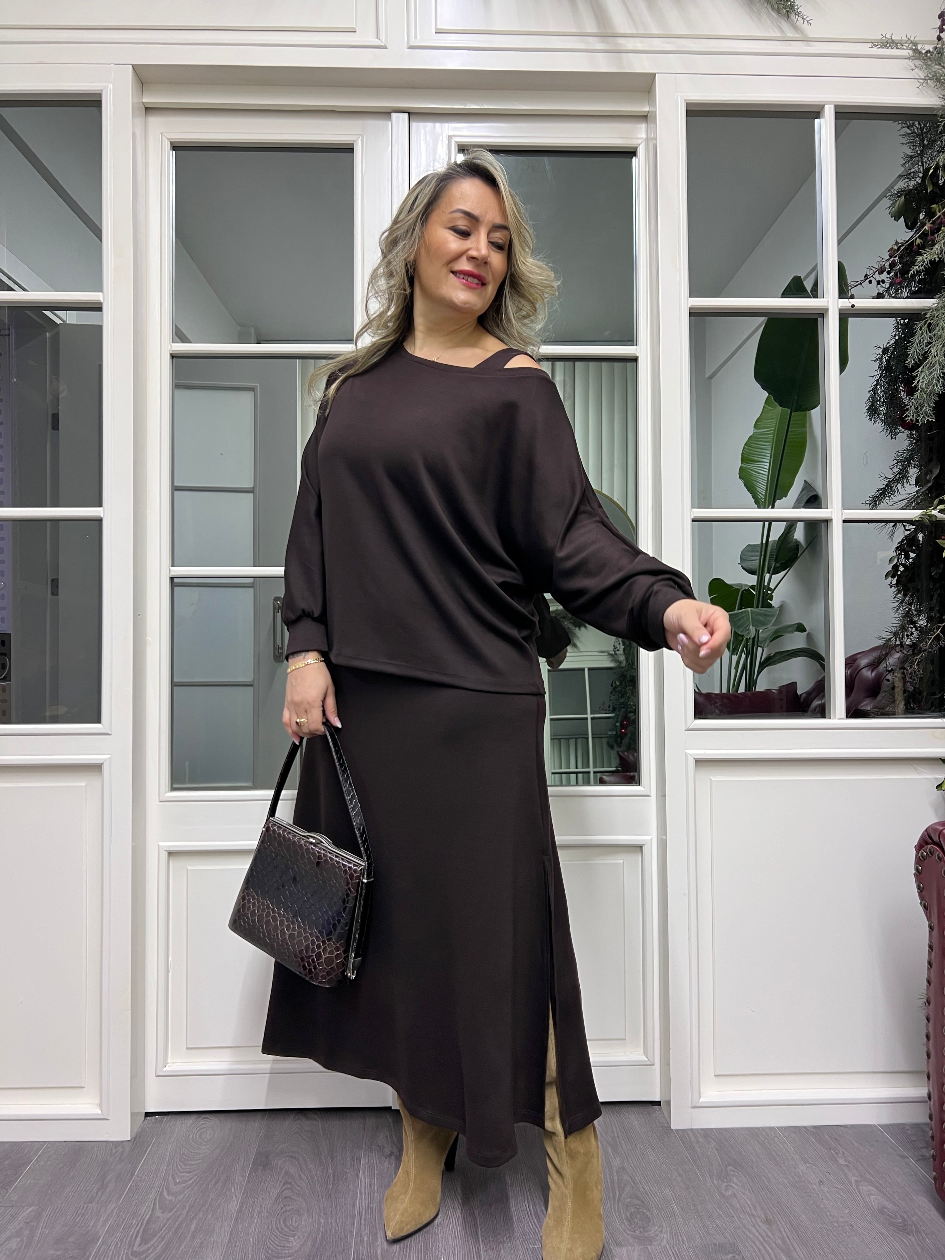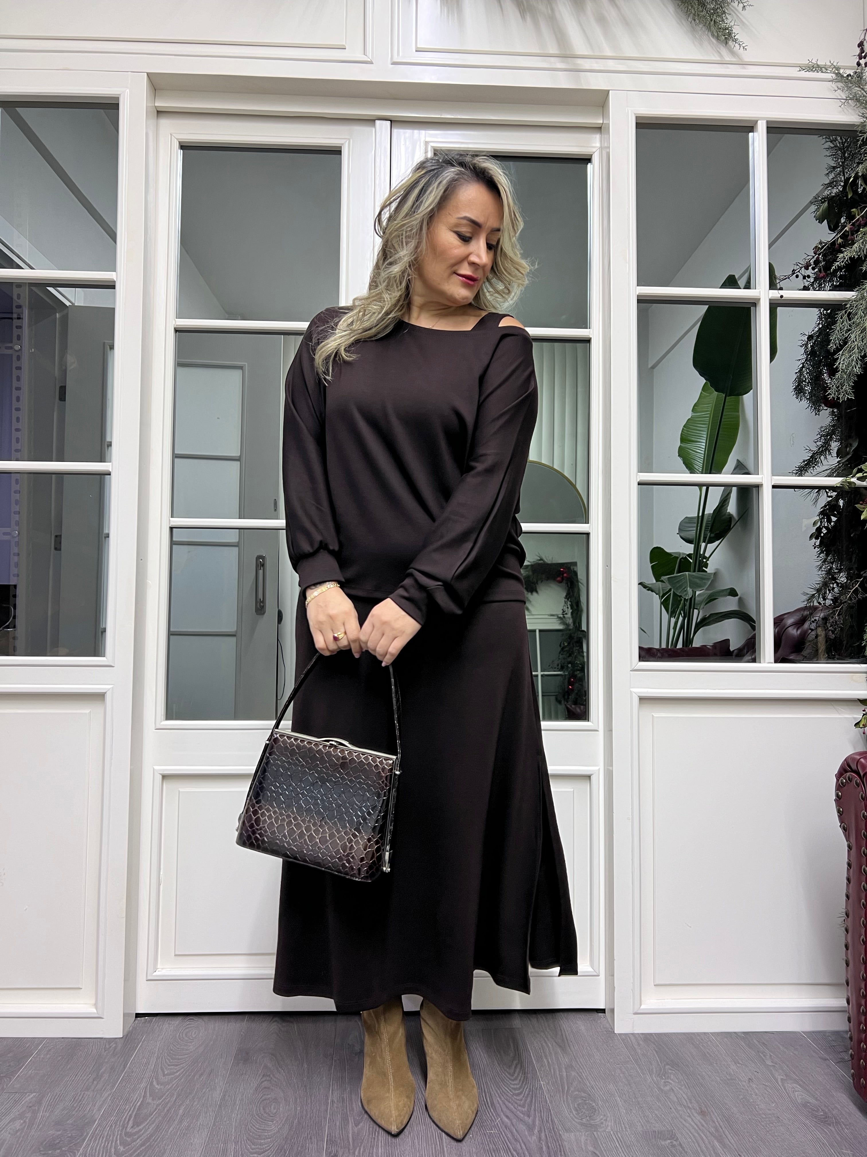 A02236 kahve bluz takımlı elbise